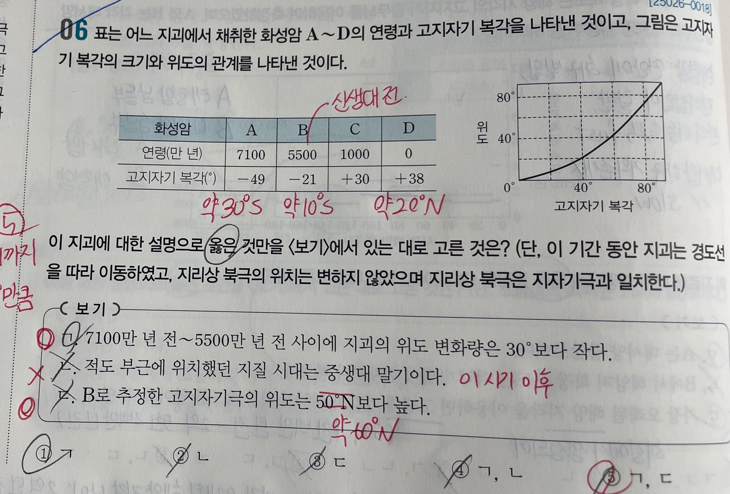 B로 추정한 고지자기극의 위도가 제가 봤을 때는 10 ° N 같은데 해설지에는 약 60 ° N 이라고 하네요, 왜 60 ° N 인지 알고 싶습니다