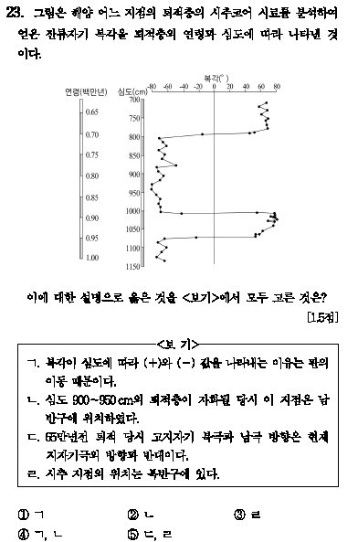 작성자Breeze~ 작성시간 09.07.08 23번 ㄷ에서 전 65만년전과 지금 복각이 같은 부호라서 현재 지자기극 방향과 같은방향이아닌가.,..-_-죄송 ; ㄹ에서 현재는 북반구가 북극인데,,자북극에서는 복각이 +90도 이고 그래프에서 볼때 현재의 복각은 +값이니까 시추지점이 북반구에 있다고 볼 수 있겠죠ㅎ허술하네요.''ㅠㅜ