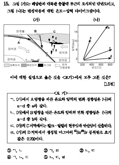 작성자샘이되쟈^o^ 작성시간 09.07.09 15번은...작년에 시험본 시험지를 보니까 ㄱ ㄴ ㄷ이 확실하게 맞다고 막 똥그라미 엄청 쳐놨는데 지금은 왜 그게 답인지 기억이 가물가물하네요+_+ 그냥 대략 기억나는대로라면.. (나) 그래프에서 a는 프란시스칸, b는 삼바가와, c는 부칸 또는 바로비안, d는 접촉 변성상 계열이라 판단했어요. (가) 그림에서 A는 퇴적물을 얹고 섭입해들어가는 해양지각 부분이에요. A화살표가 섭입대 깊숙히까지 뻗어있지는 않지만, 최소한 멜란지압쇄암부터 시작되는 최저온의 변성상계열을 따를 것임은 분명한것같았어요. 그래서 A는 (나)그래프의 a와 연결지었습니다요. (가)그림의 B는 화살표가 지나는 지역이 섭입대가 아니라 섭입대와 화산호의 중간