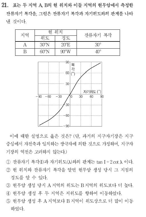 작성자지 to the 학 작성시간 10.07.23 음.. 저는 그래프를 통해서 자기위도를 구하는것 같은데요. 기출문제에서 답변 달아주신 분이 30도라고 하셨던것은, 그래프상 30도와 가깝게 위치해서 그렇게 말씀하신게 아닌가 싶습니다. 그렇지않고, 우리가 알고있는 탄젠트식을 사용해서 풀 경우.. 공학용계산기가 꼭 필요하겠네요~~! 어쨋든 그래서 제 생각에는 A지역은 그래프상 15도에 딱 떨어지지만, B지역은 딱 떨어지지는 않지만 30도 근처에 있고 이 사실만으로도 문제푸는데는 별 지장이 없어보입니다!!
