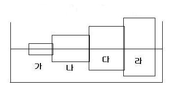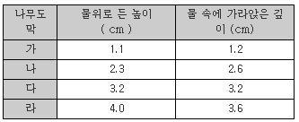 그림과 같이 지각 평형의 원리를 알아보기 위하여 밀도가 각각 다른 나무 토막을 물속에 띄우고, 나무 토막이 뜬 높이와 가라앉은 깊이를 측정한 결과가 표와 같다.