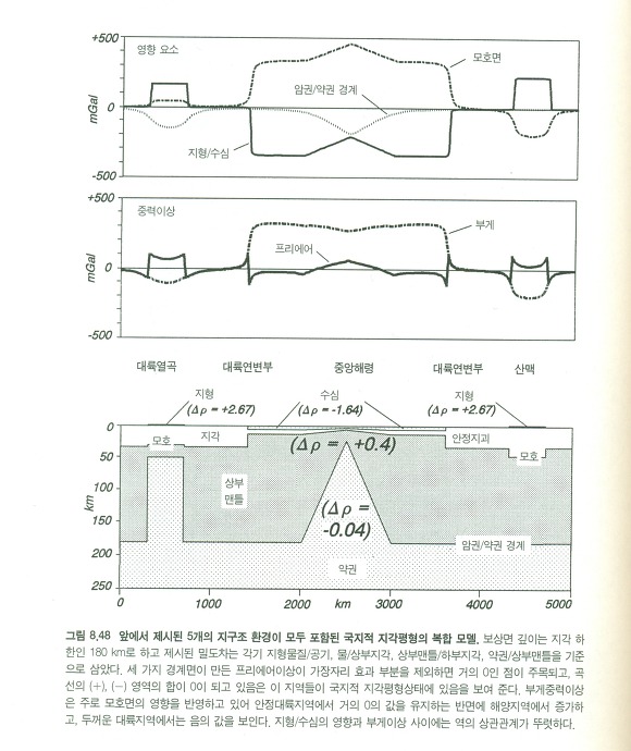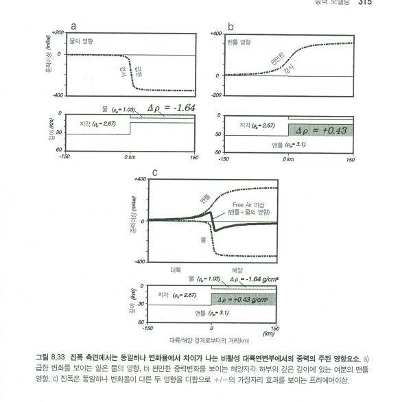 그림 8.33을 보면 물과 맨틀의 밀도차에 의해서 중력이상이 생기잖아요.