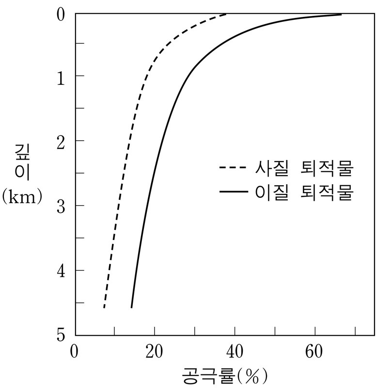퇴적물이 퇴적될 때 물의 영향으로 입자간 간격이 넓다고 해도, 심부로 내려가면 압력에 의해 퇴적물 내의 물이 제거되므로 이질 퇴적물의 공극률이 더 낮아야 하는거 아닌가요?
