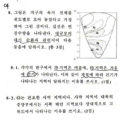 8-1번 풀이를 보니 (가)지역은 대륙의 서안에 위치해있고 위도 30~40도로 편서풍대에 속하여 해양성 기후의 영향을 받고 , (다)지역은 아열대 고기압에 위치하며 내륙에 있으므로 대륙성 기후가 나타나기 때문이다.