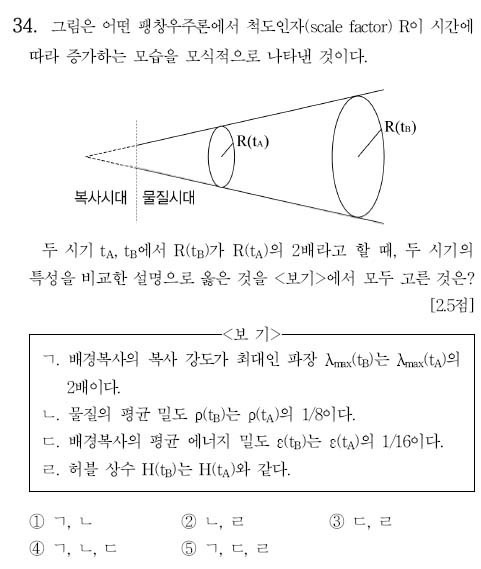<10-34> 우주론 질문 드려요. 작성자할수잇다!!!|작성시간14.09.28|조회수839 목록 댓글 1 글자크기 작게가 글자크기 크게가 문제에 제시된 R의 비교를 통해 ㄱ, ㄴ, ㄷ은 해결했어요.ㄹ에서 tA tB의 시간이 다르므로 허블상수가 다르다 라고 생각하는건 너무 일차원적인것 같아서 질문 남겨봐요. 어떤분께서는 R이달라져서 밀도가 달라지므로 팽창률이 달라져 허블상수가 달라진다고 하셨는데, 이렇게 이해하는게 맞는건가요?! 다음검색 현재 게시글 추가 기능 열기 북마크 공유하기 신고 센터로 신고 댓글 댓글 1 댓글쓰기 답글쓰기 댓글 리스트 작성자白日莫虛送靑春不再來 | 작성시간 14.10.09 단순하게 하심이... 허블상수 H= v/R에서 v=R' 입니다. 그림상에서 R'(거리 변화량)은 동일(기울기의 변화가 없음)하므로 R의 비를 보시면 됩니다.H∝1/R이므로 2H(Tb)=H(Ta) 입니다.그림상에서의 기울기 변화가 없는 그림이므로 그림만 봤을 때 팽창률의 변화는 없습니다.하지만 실제 다른 그림들을 보면 우주의 팽창을 나타낸 그림을 보면 기울기가 다름을 아실 수 있습니다. 댓글 전체보기