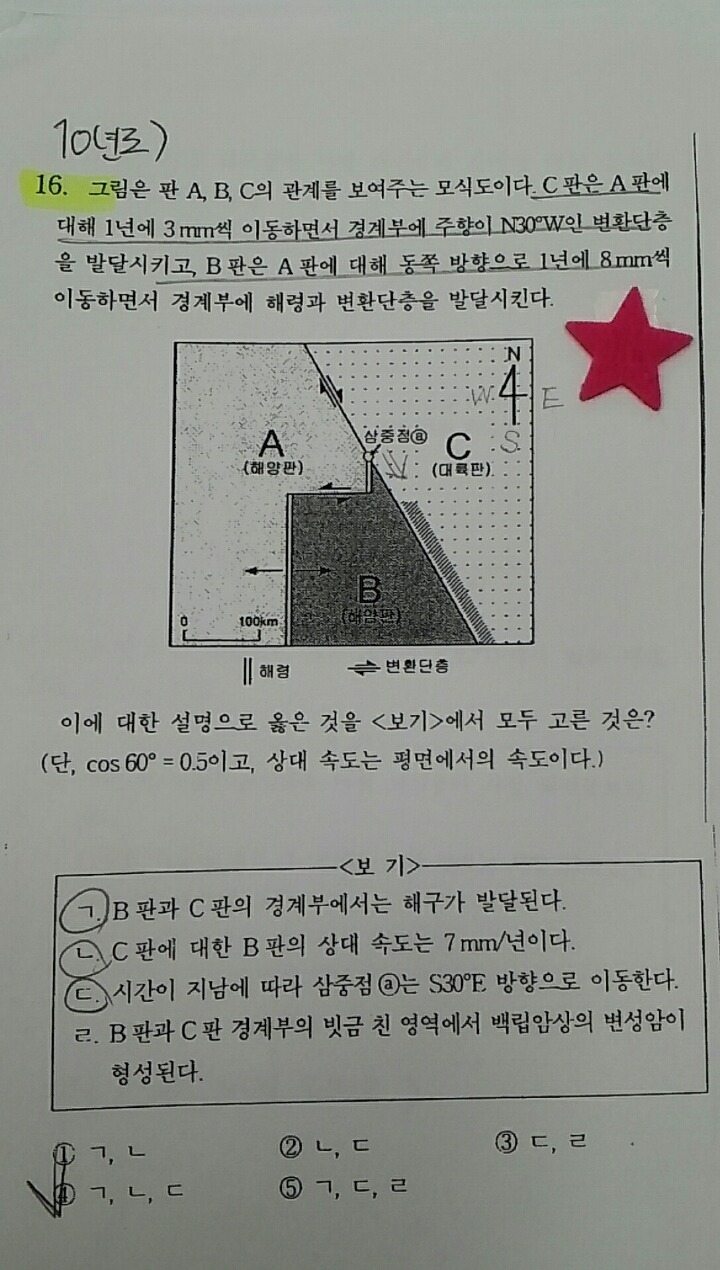 10년 16번 기출 질문이요 작성자딸기가좋아|작성시간14.12.01|조회수1,575 목록 댓글 0 글자크기 작게가 글자크기 크게가 여기서 ㄷ보기 설명부탁드려요!ㄴ보기는 벡터로 계산하면 7mm/년이 나오는데 B판은 8mm/년으로 더 빨리 섭입하잖아요.그런데도 삼중점은 C판 따라서 내려오는 쪽으로 이동하나요? 다음검색 현재 게시글 추가 기능 열기 북마크 공유하기 신고 센터로 신고 댓글 댓글 0 댓글쓰기 답글쓰기 댓글 리스트