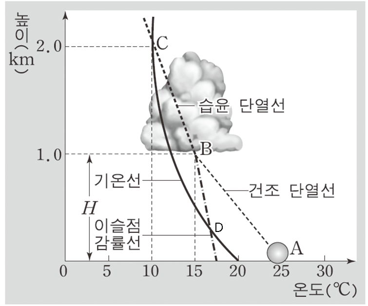 D : 대류응결고도 (이슬점감률선과 기온선이 만나는 고도)