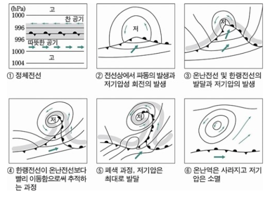 온대저기압의 발생과정을 보면 보통 아래 그림과 같은 발달과정이 나옵니다.