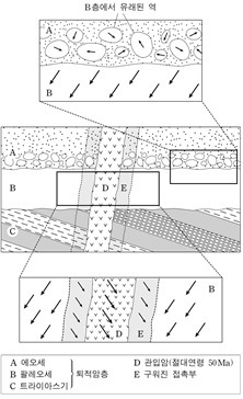 B의 잔류자기를 갖는 암석들이 풍화, 침식 받고 다시 쌓이면서(굴러다니면서?) 방향이 제각각으로 배열된 것 같은데