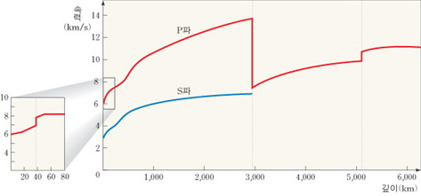 또 맨틀에서 외핵으로 진행할 때는 속도가 많이 떨어졌는데