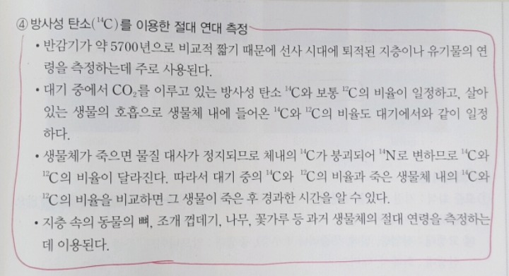 탄소를 공급받고 배출하므로 일정한데 죽으면, 일정한 동위원소비를 갖는 탄소를 공급받지 못하기 때문에 일정한 주기로 계속적인 방사성 붕괴가 일어나 나이를 측정할 수 있는 겁니다.