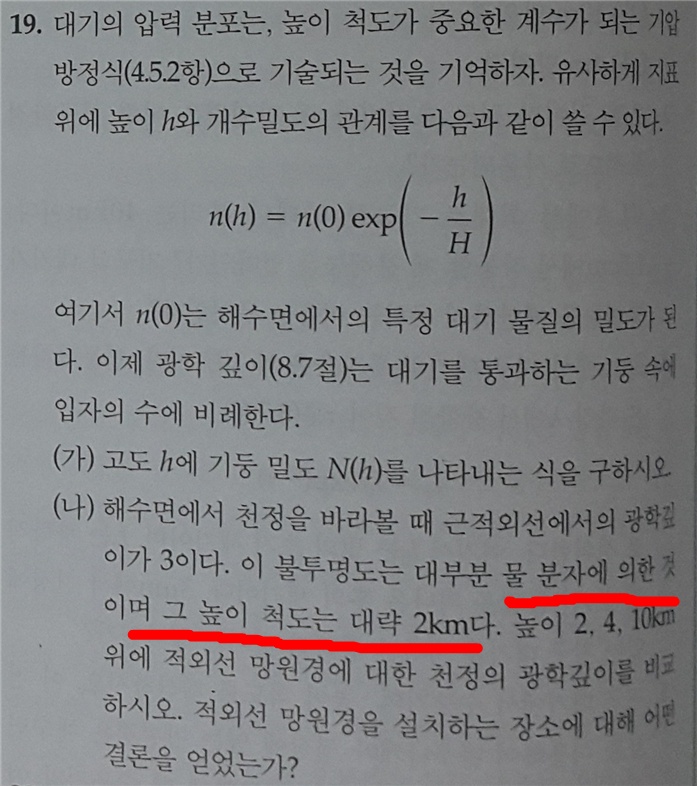 천천서 9장 연습문제 19번에서 물분자의 높이척도가 2km라고 나왔는데 높이척도 식이 H = kT/mg이고 물분자의 분자량이 18amu이어서 식에 넣어서 계산해보면 H = 1.38*10^-23*270/(18*1.66*10^-27*9.8) = 12.7km 로 나옵니다