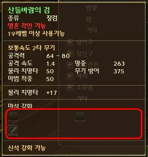 하지만 여기에는 마석 강화 슬롯이 3개이고, 아래 슬롯에는 검 모양의 아이콘이 붙어있다 |