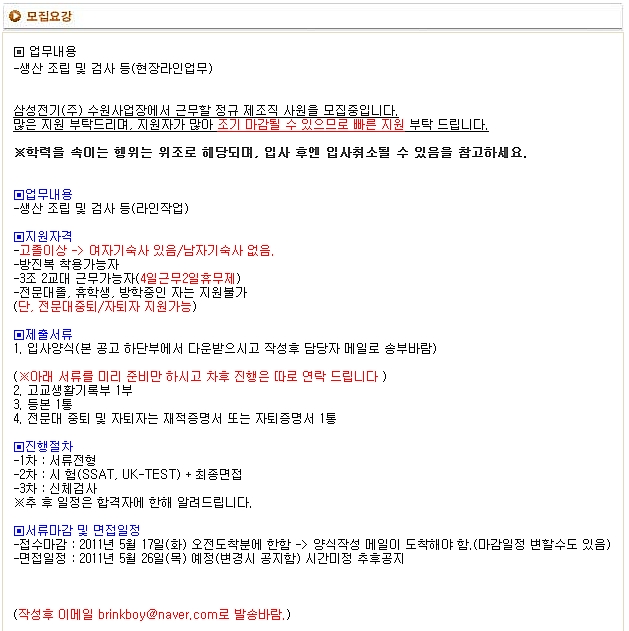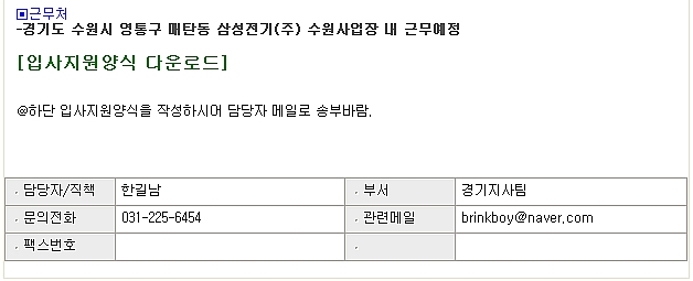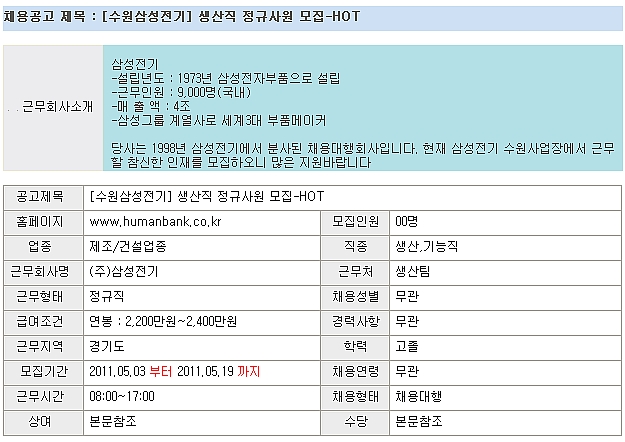[[ 삼성구룹 ]][ 삼성전기 ] 수원 생산직 정규직 모집 ( 연봉 2400 이상, 3조 2교대, 상여 800% ) ~ 5월 19일까지 작성자사랑해|작성시간11.05.04|조회수332 목록 댓글 0 글자크기 작게가 글자크기 크게가 온라인 지원 : http://www.humanbank.co.kr/ 다음검색 현재 게시글 추가 기능 열기 북마크 공유하기 신고 센터로 신고 댓글 댓글 0 댓글쓰기 답글쓰기 댓글 리스트