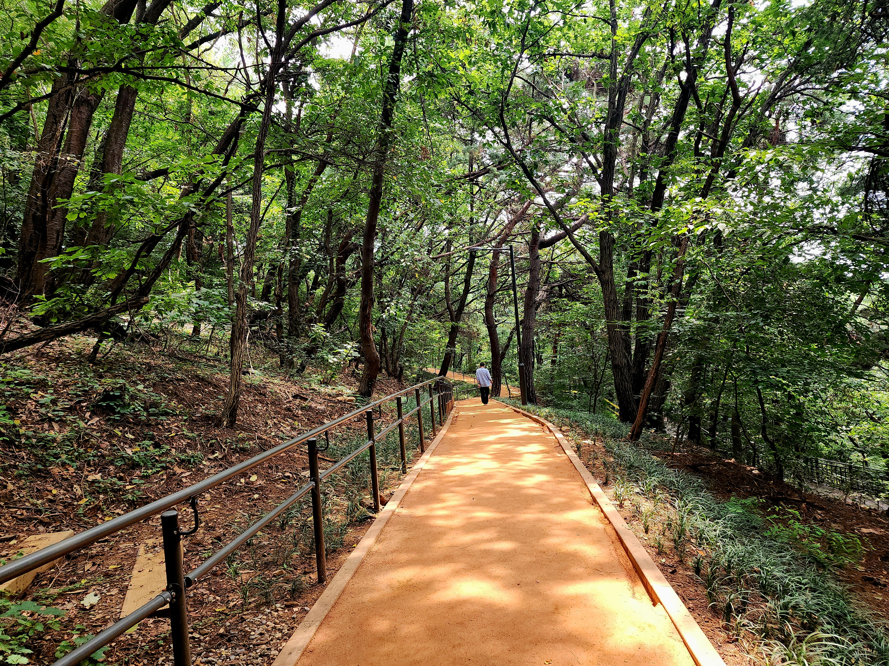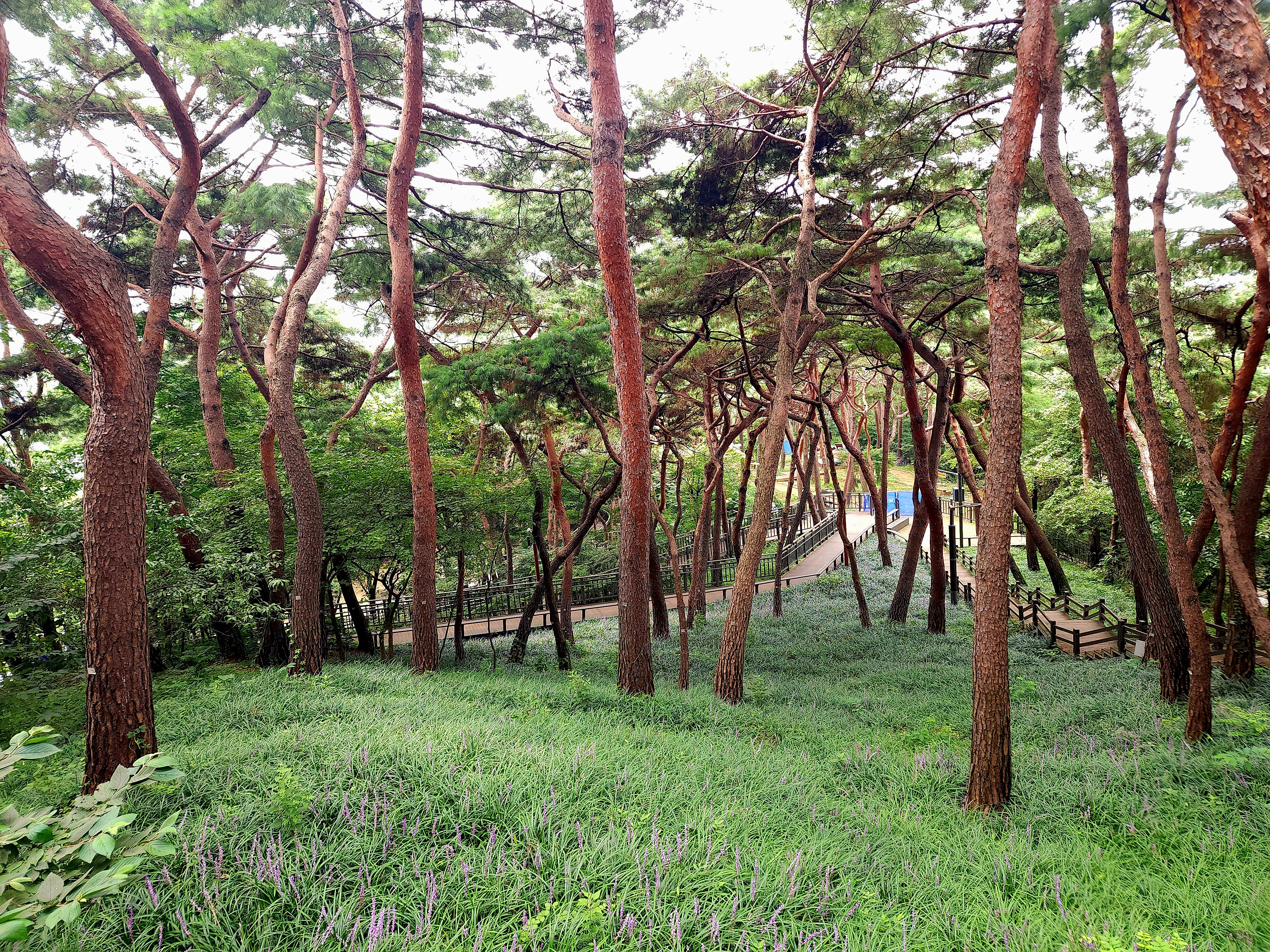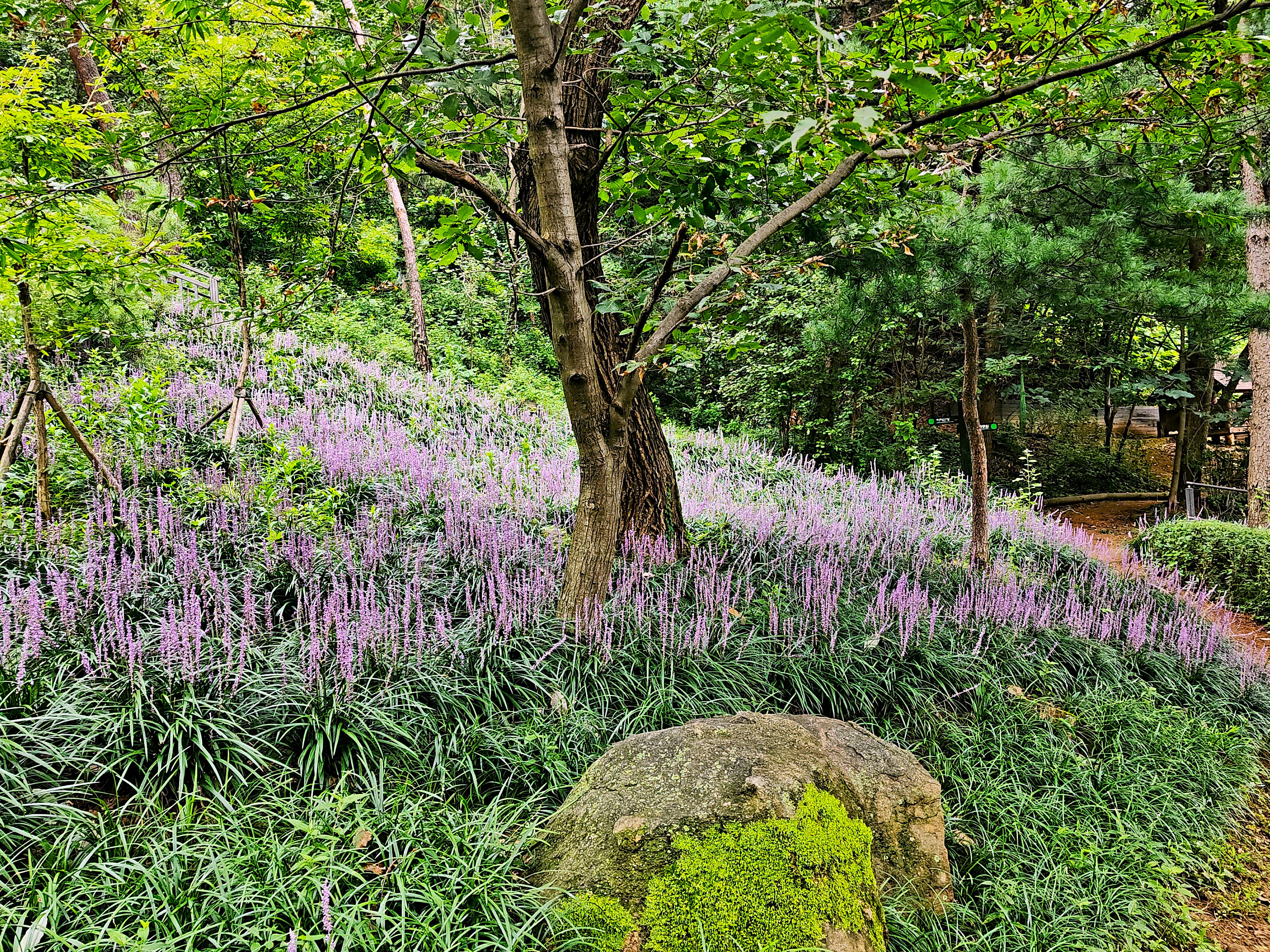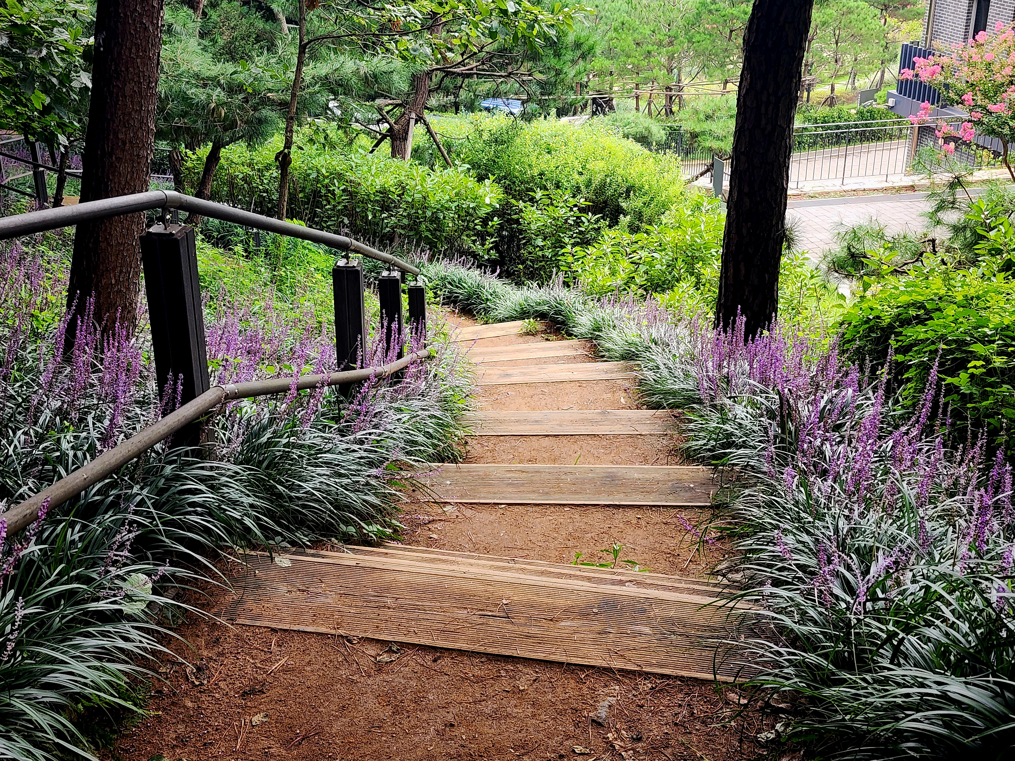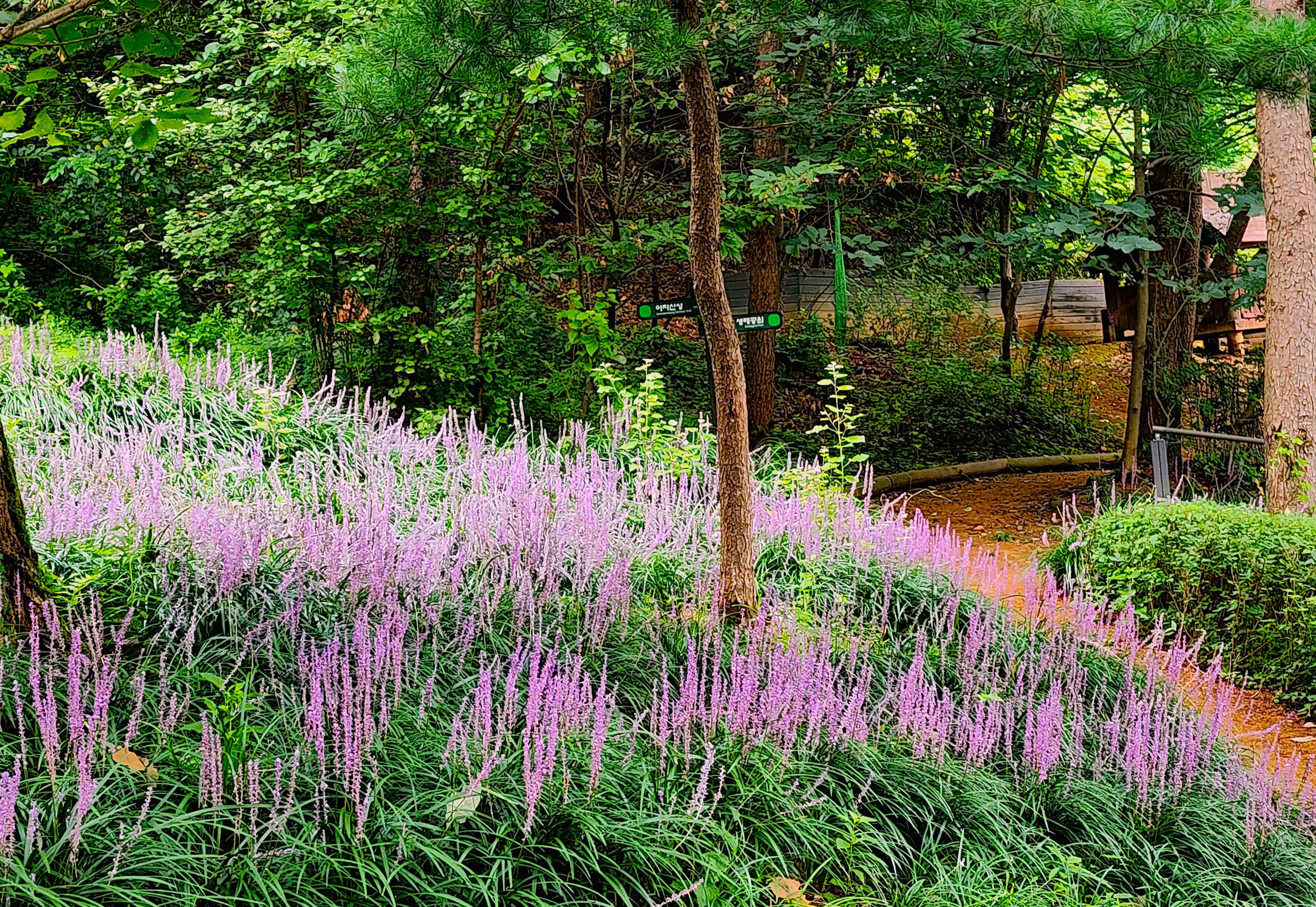 길을 잘 만들어 놓았고 소나무와 어우러진 맥문동꽃도