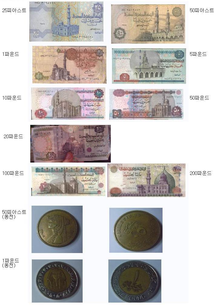 이집트의 통화는 이집트 파운드(£E), 보조단위는 파이스토르(pt.)