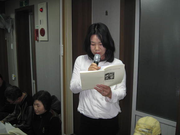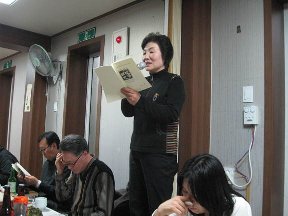 정순란 시인의 '잠깨는 봄' 시를 후원회장 김진숙 사장이 낭독하다.