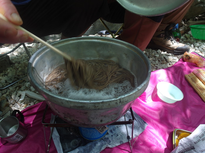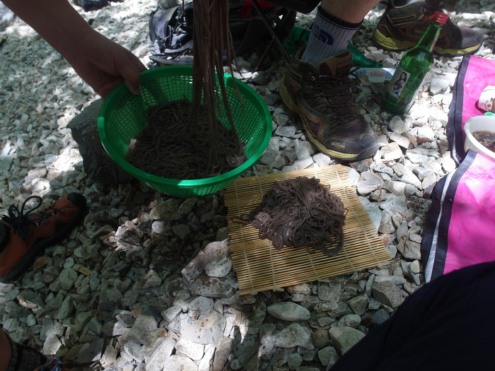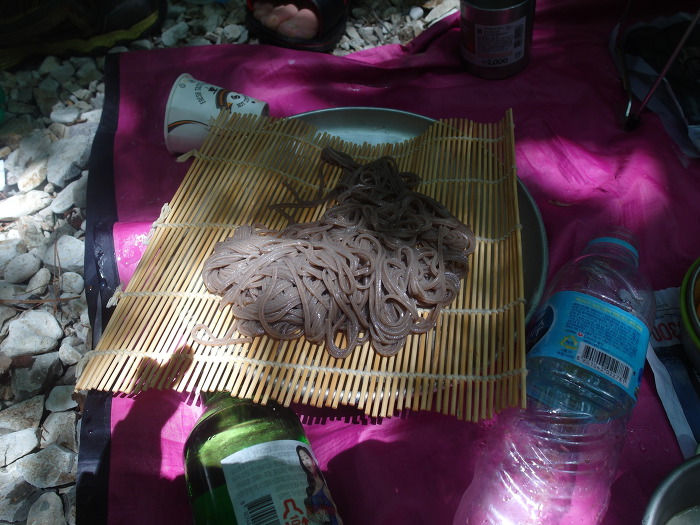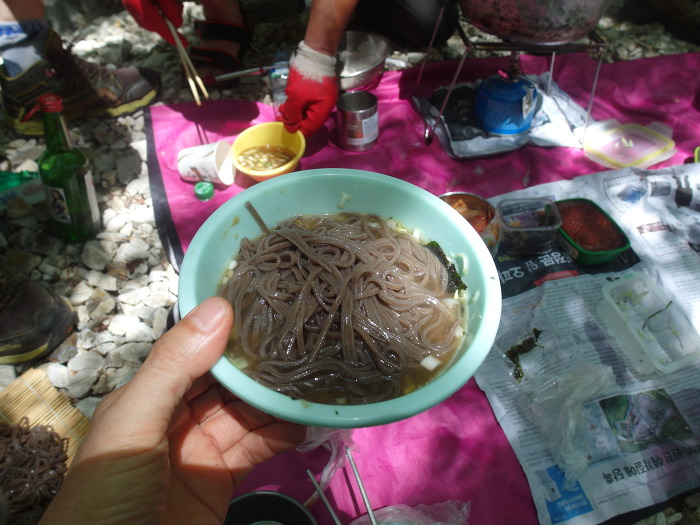 차가운 육수에다 무우 간것, 고추냉이에 김 썬것, 오이 채, 다시마, 얼음.. 이렇게 준비해 왔답니다..