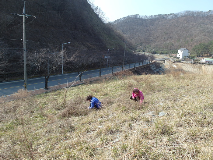 저수지 둑에서 벌서 숙을 캐고 게시네요~~..