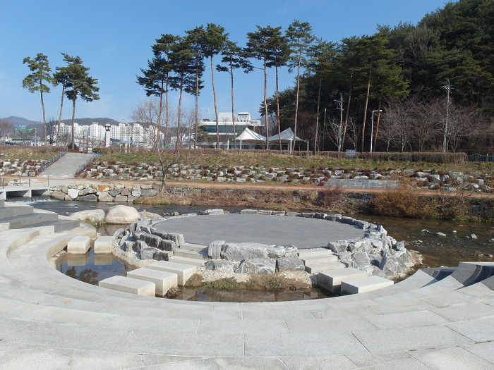 원래 있던 바위들 사이로 물이 흘러 내립니다.. 우체국 간판이 보입니다..덕산마을..