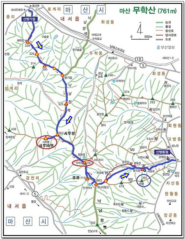 부산일보의 지형도상에는 중봉으로 올라갔다가 개나리동산 쪽으로 내려가는 길이 그려져 있길래