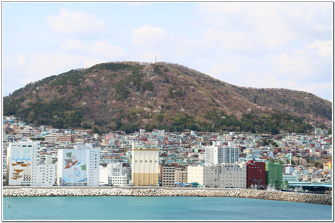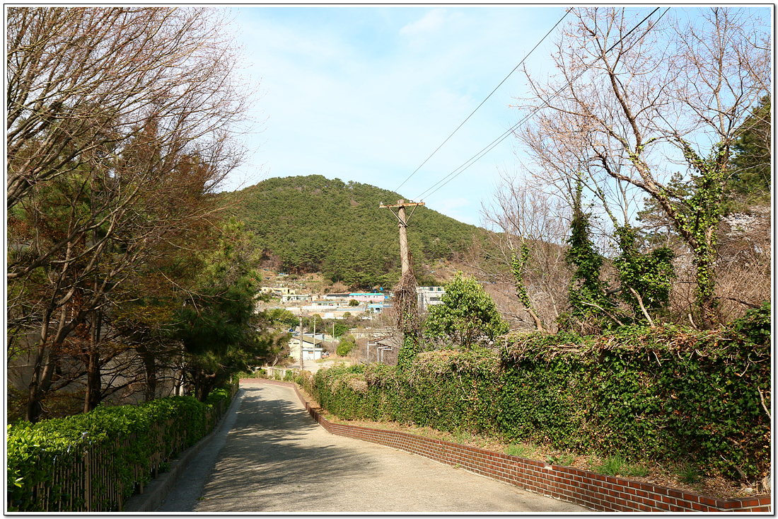 암남공원을 내려와 감천항으로 가는 길 저 앞 모지포 마을 뒤로 진정산이 보이고