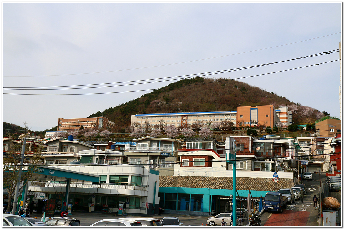 천마산 옥녀봉 아래의 감천중학교(왼쪽)와 부일전자디자인고등학교, 부일외국어고등학교 건물이 보인다