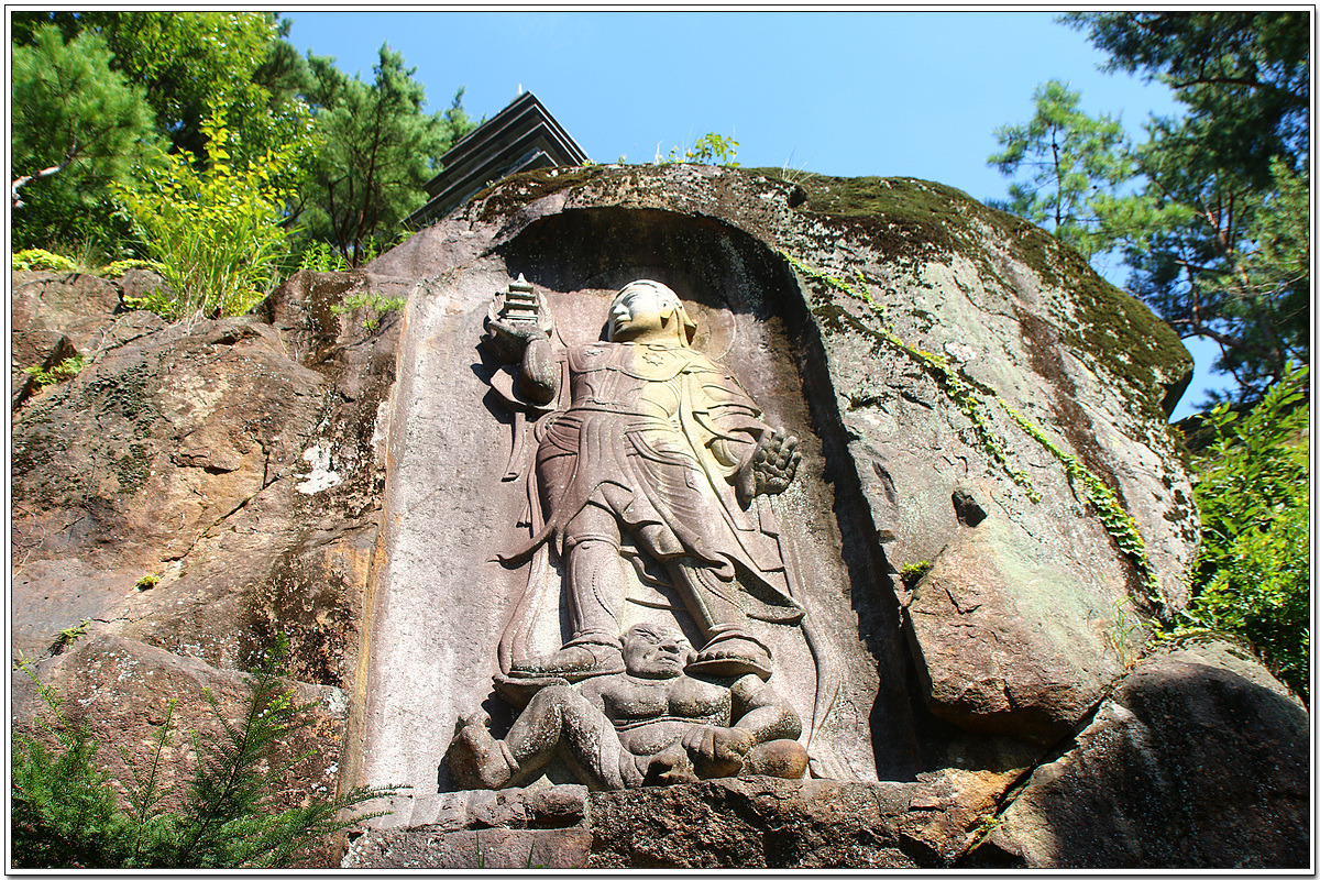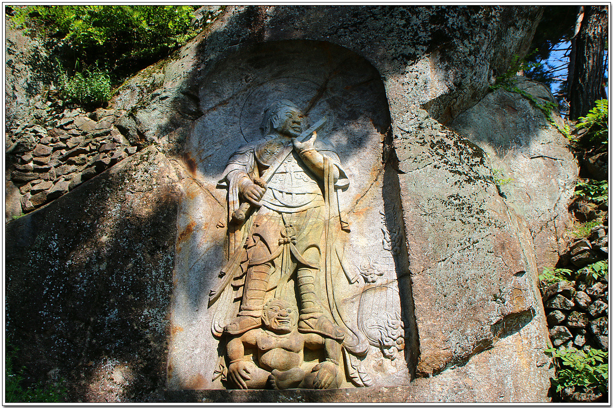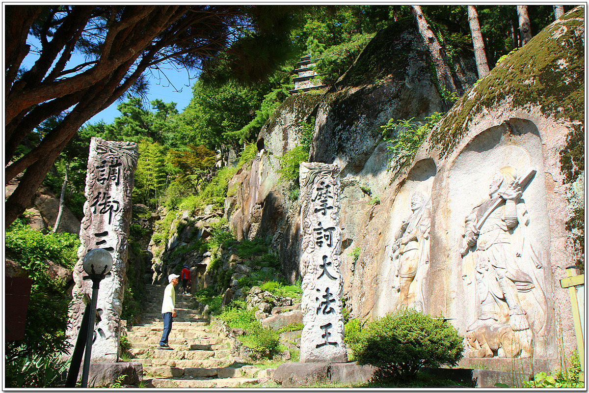 대방광문으로 가는 입구의 또 다른 석주와 거대한 사천왕상(四天王像) 부조(浮彫)