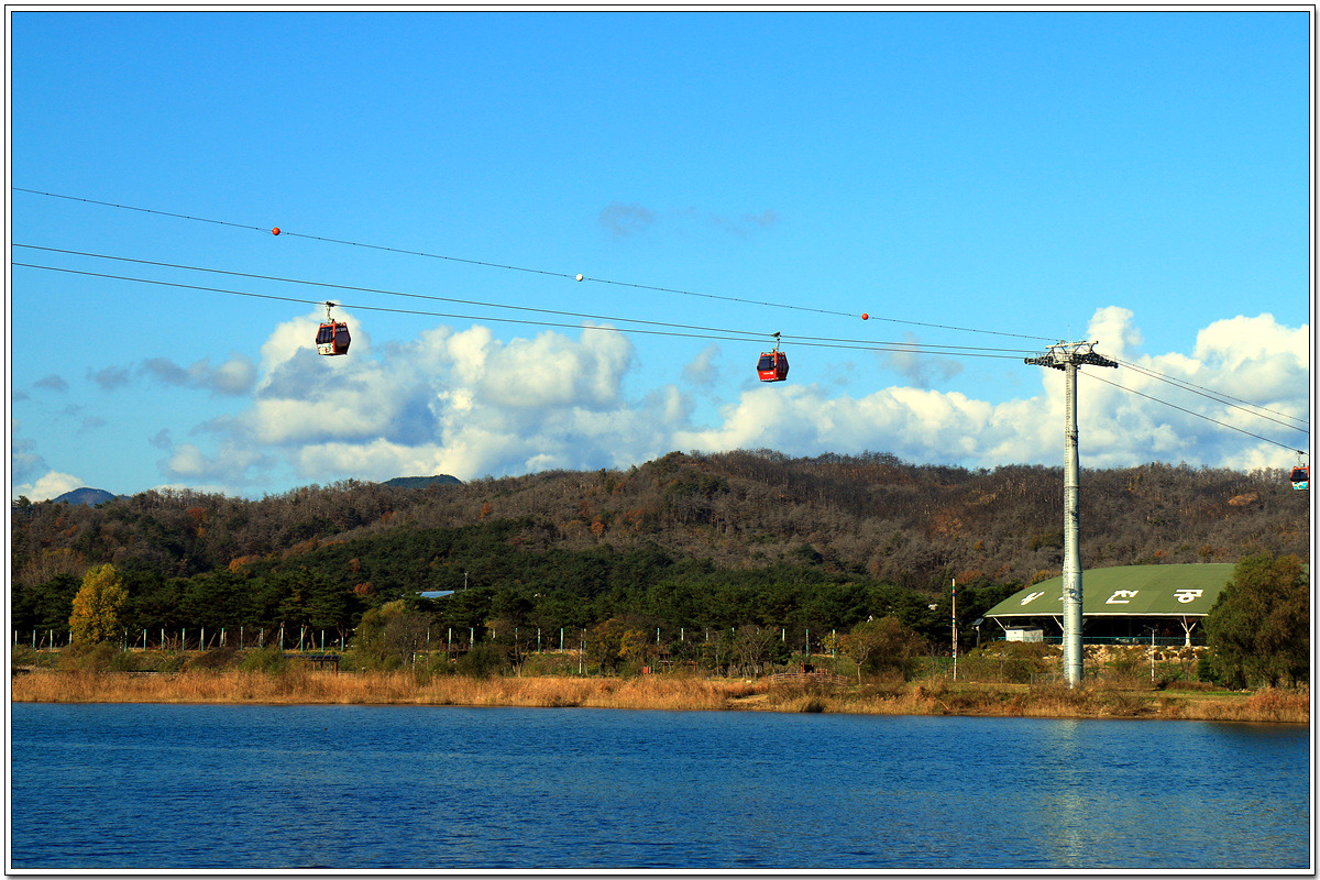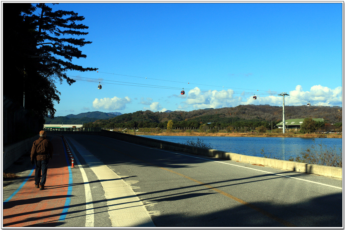 왕피천을 따라 내륙 쪽으로 가는데 저 위로 케이블카가 왕피천 위로 부지런이 움직이고 있다