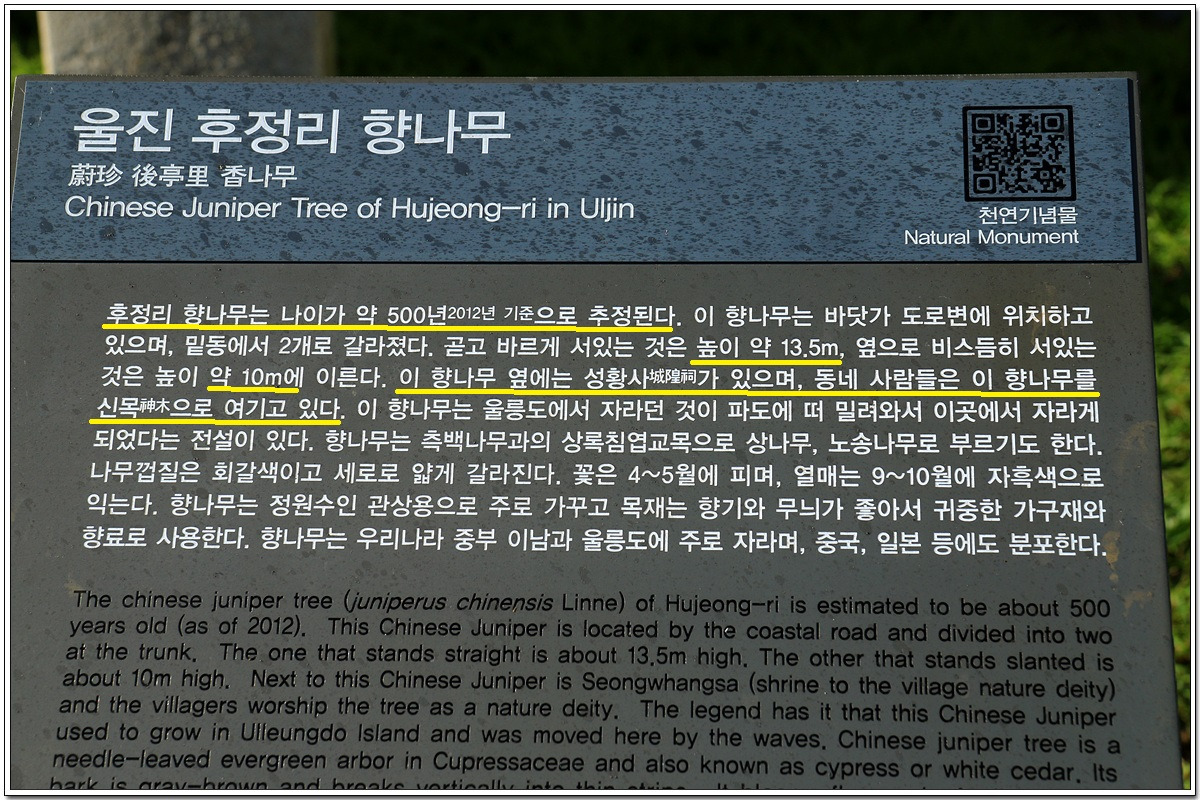 수령 500년이 넘은 울진 후정리 향나무(천연기념물)와 성황사(城隍祠)