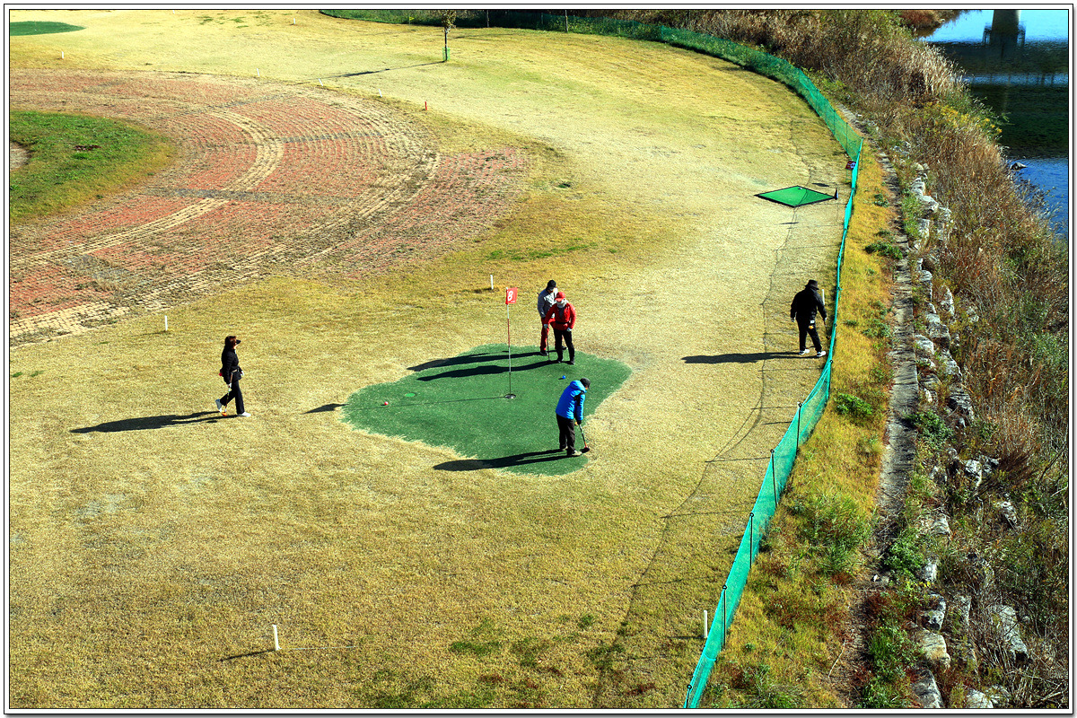 왕피천 주변 둔치는 공원으로 조성되어 있고 파크골프를 즐기고 있는 주민들이 보인다