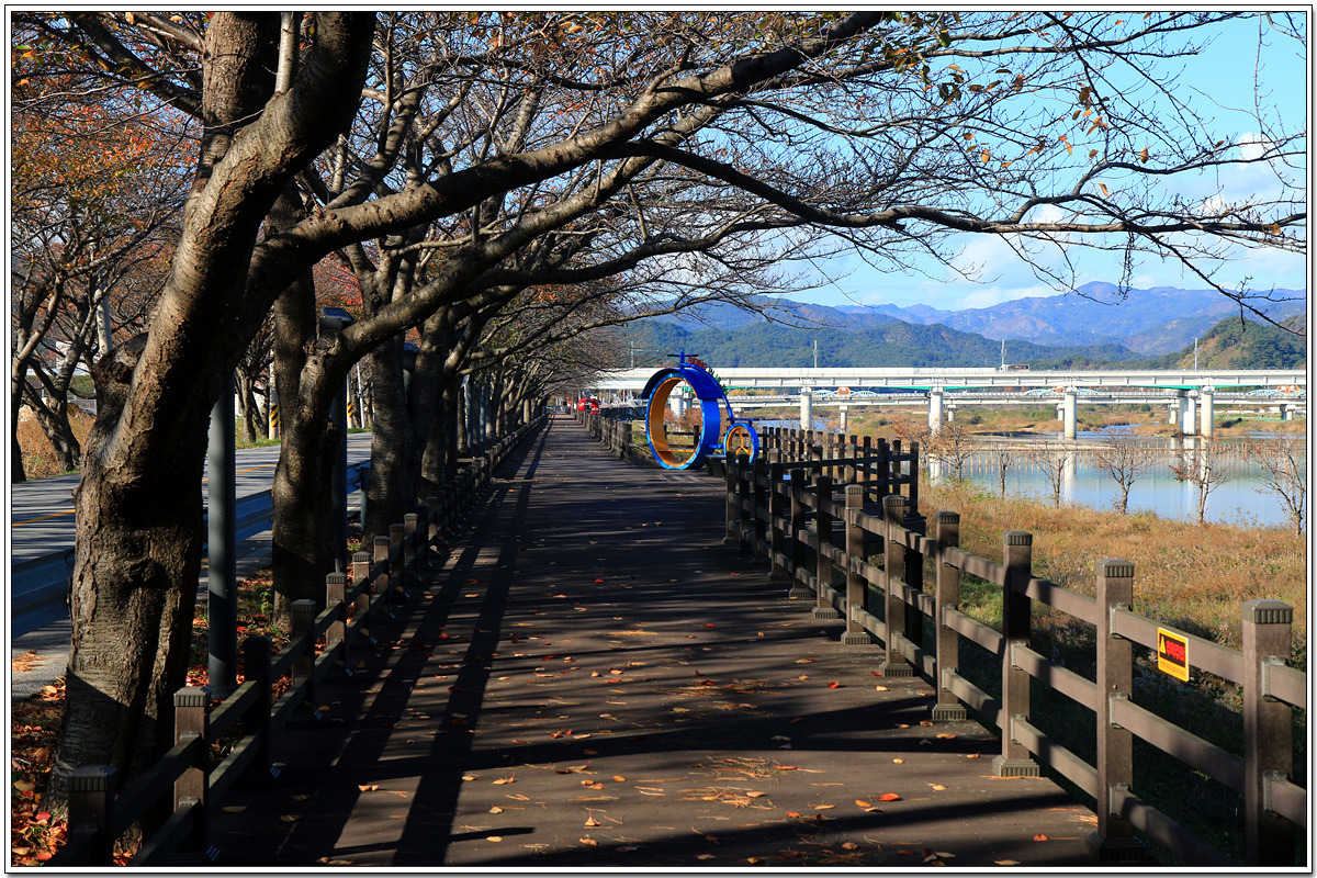 벚나무 숲을 낀 데크길을 따라, 봄철 벚꽃이 만개한 풍경을 상상하며 기분좋게 걷는다
