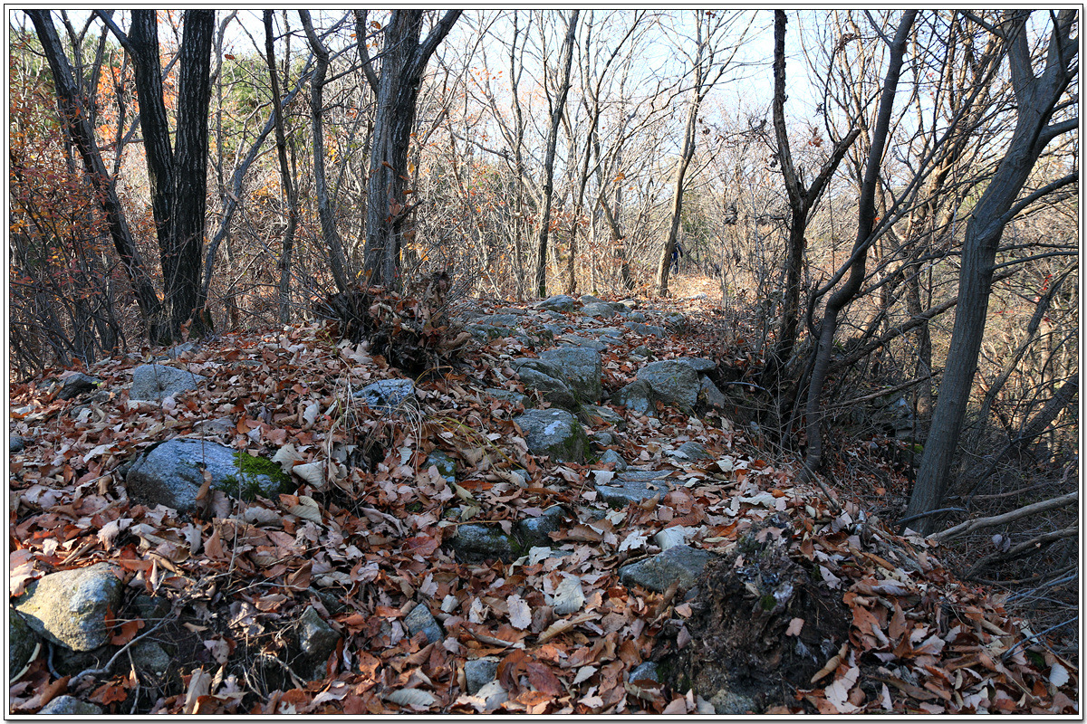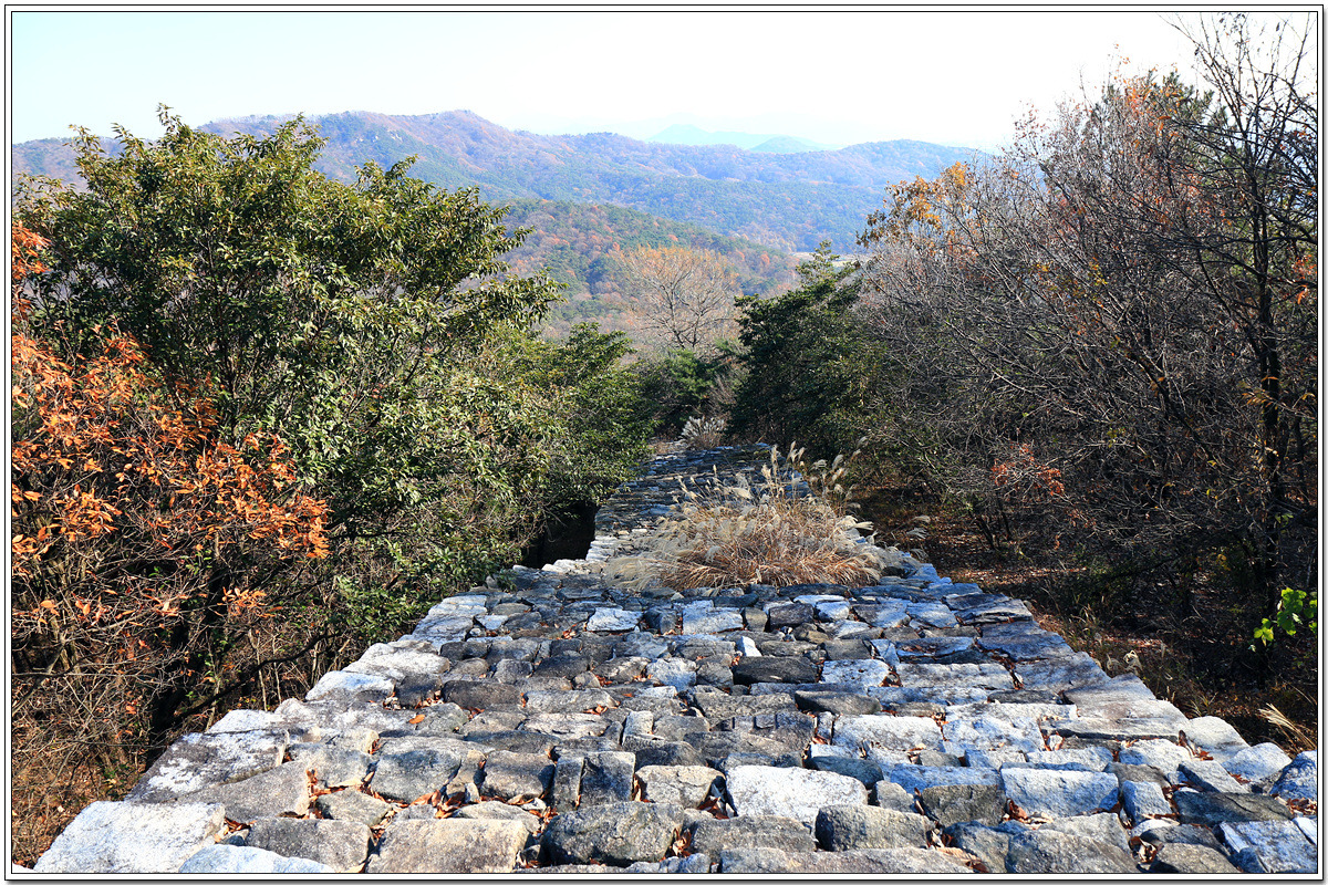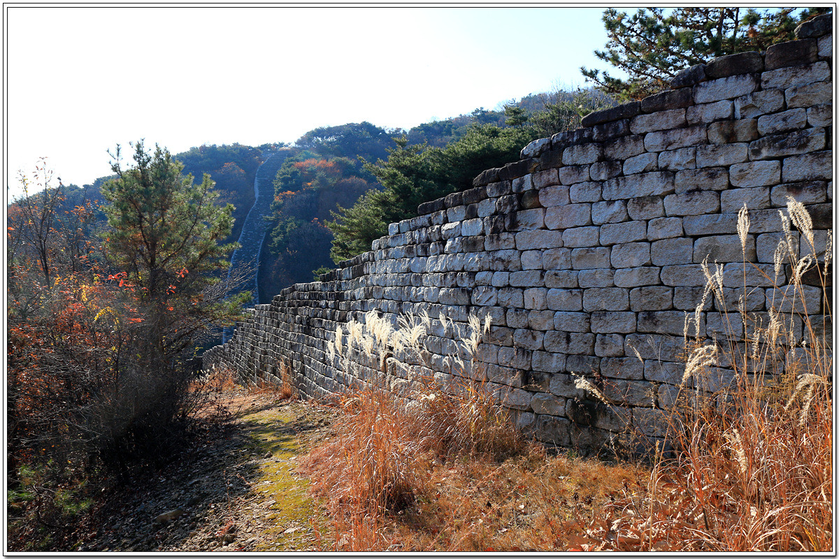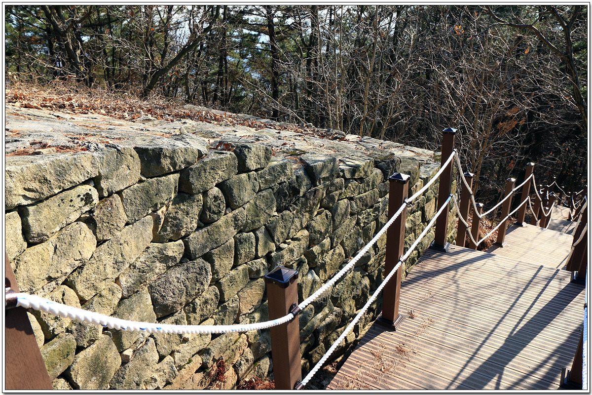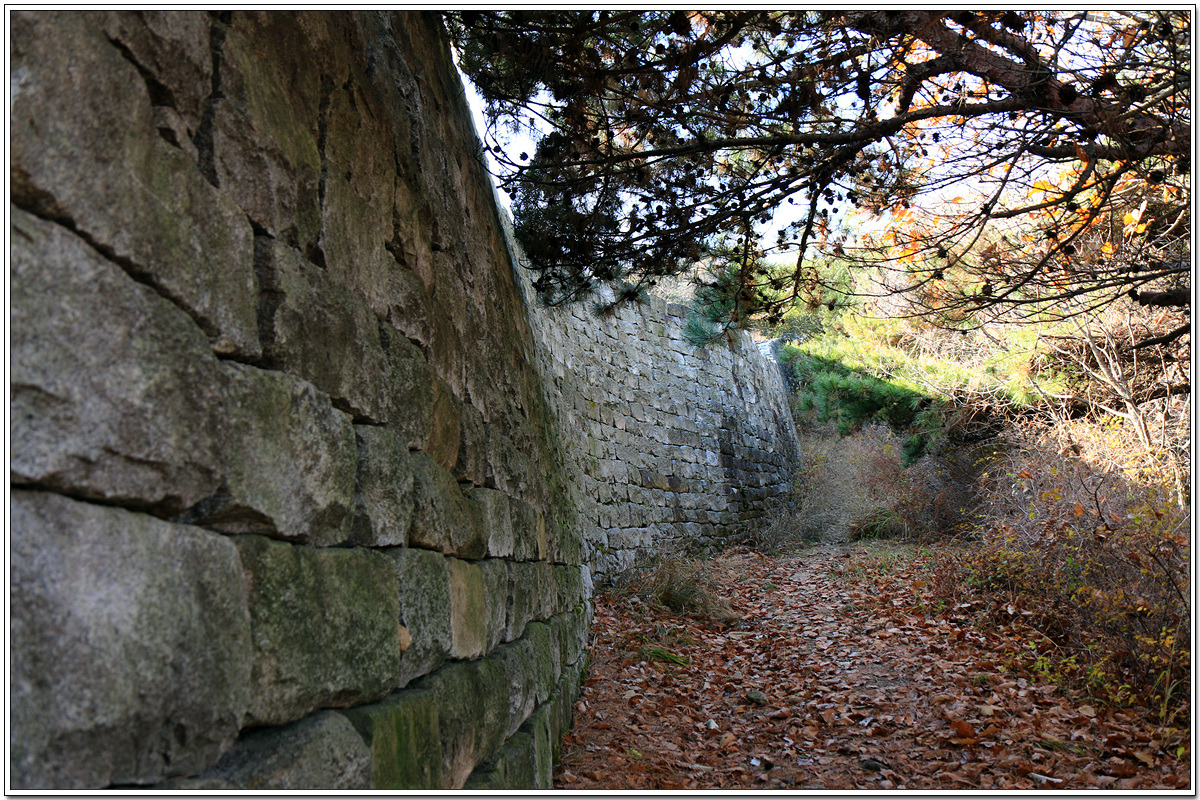 성곽 위로 올라서면 지나온 용화산 자락이 보인다