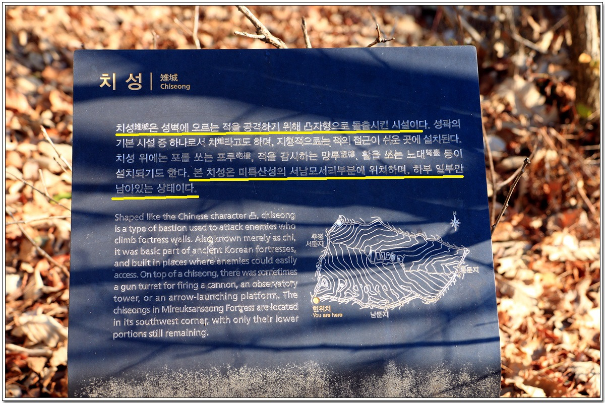 치성은 성벽을 타고 오르는 적을 공격하기 좋게 성벽 사이에 돌출시킨 공간을 말한다