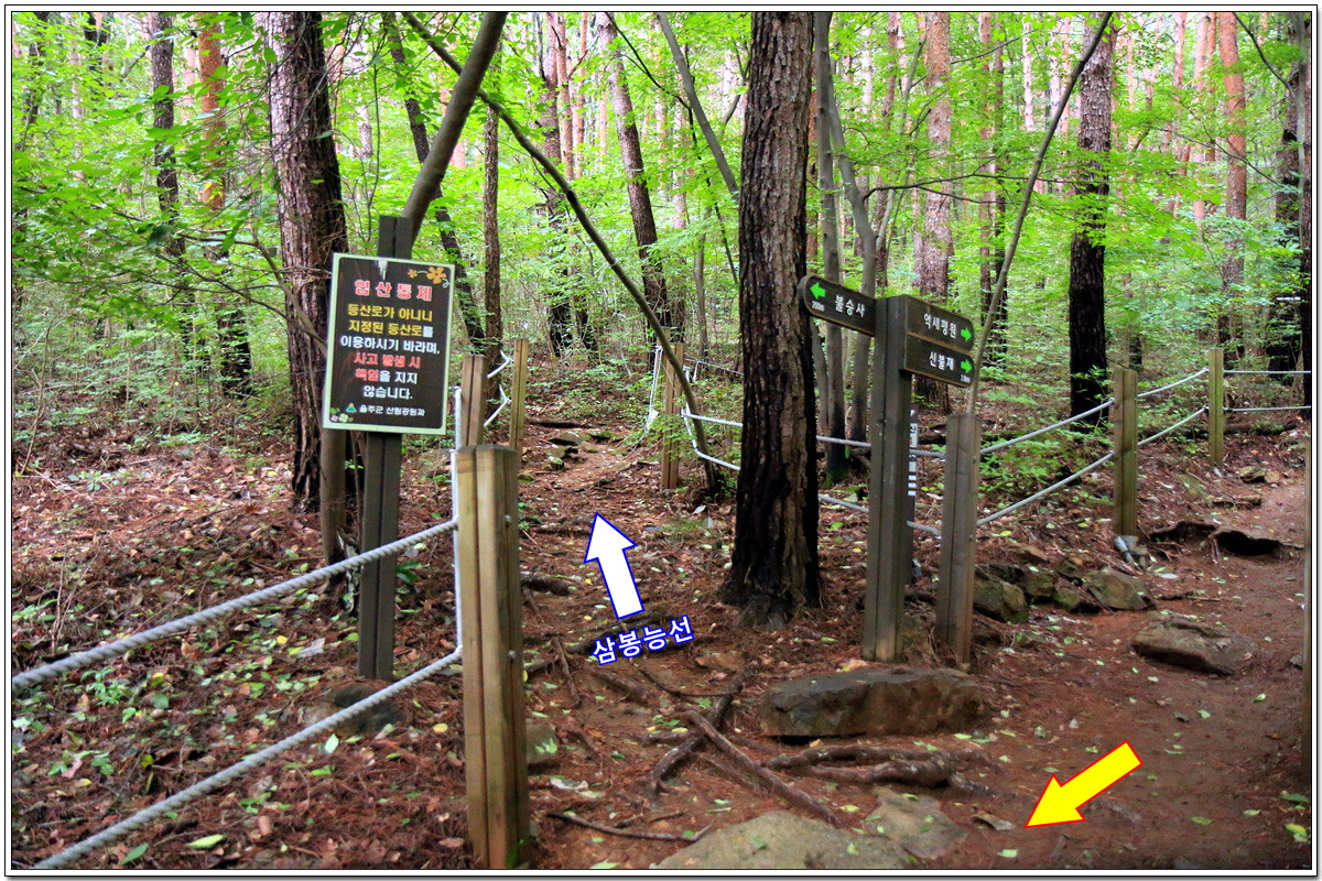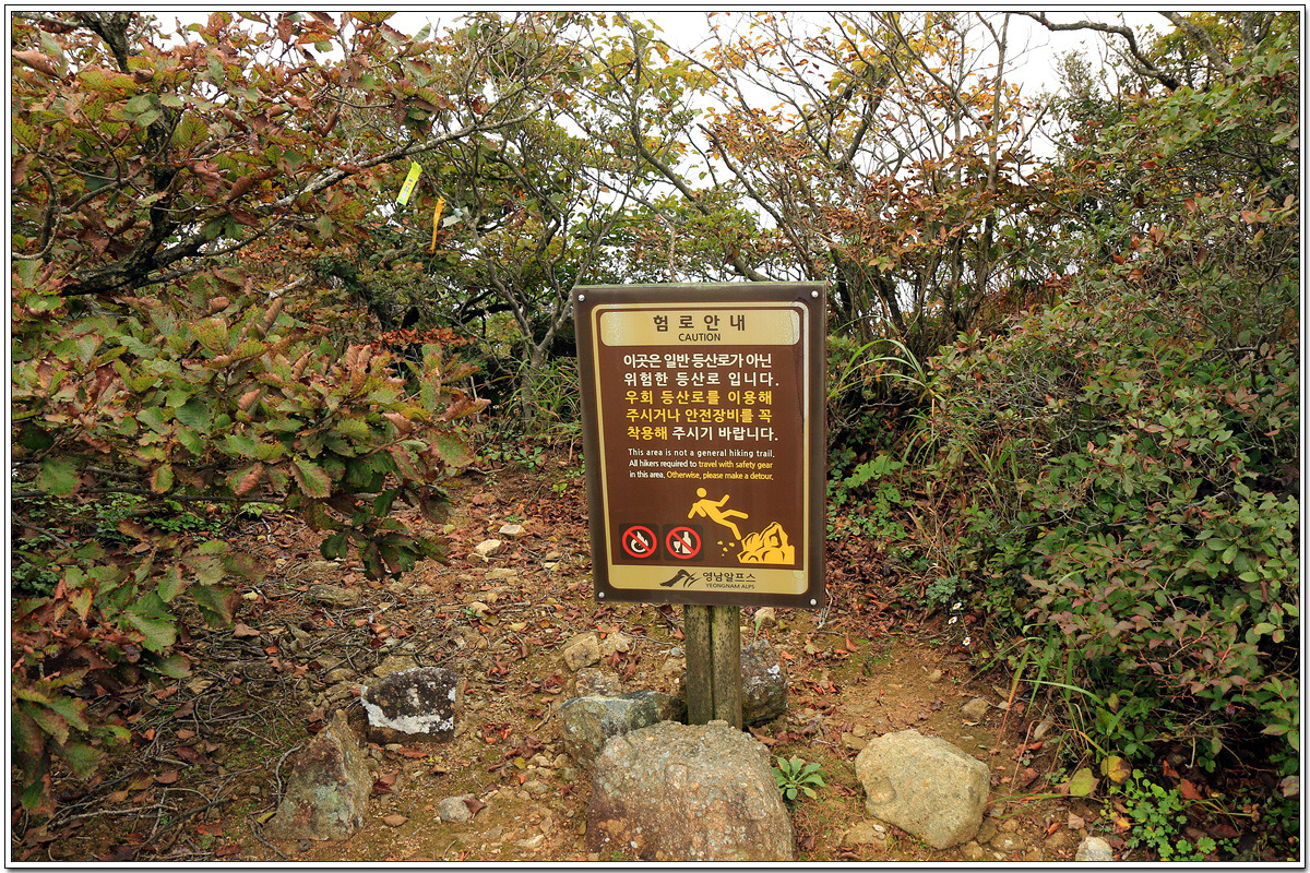 아리랑릿지 하산길을 주의시키는 안내판이 서 있고