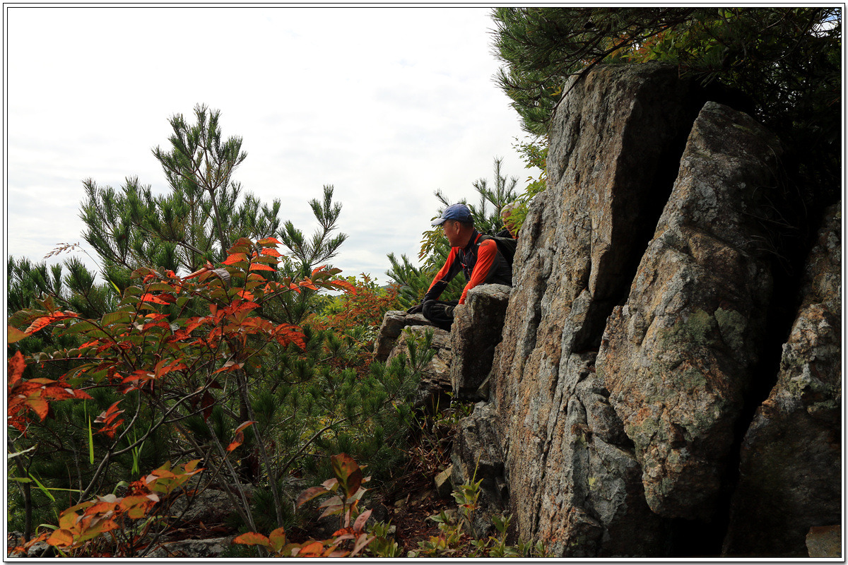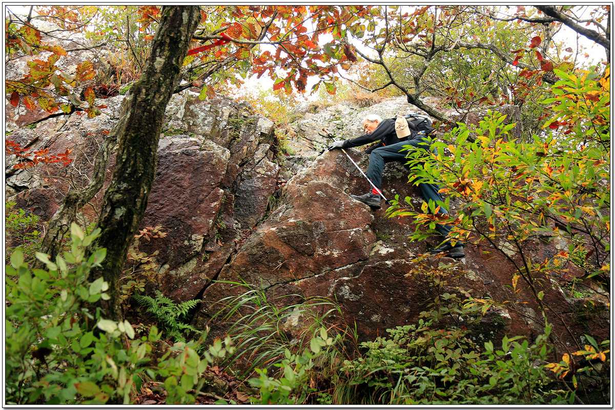 상투바위는 오른쪽으로 돌아가는 길이 있다는데, 형산은 바위 옆면을 바짝 붙어 바로 타고 오른다