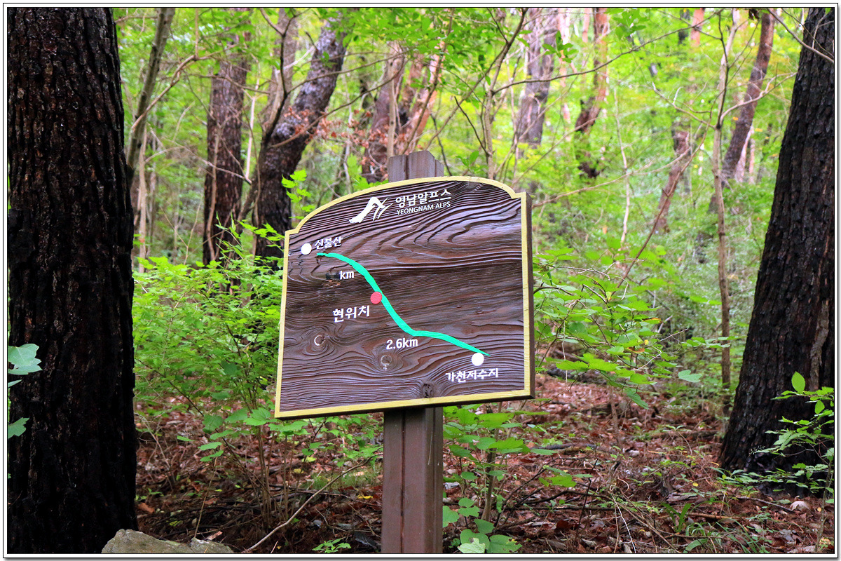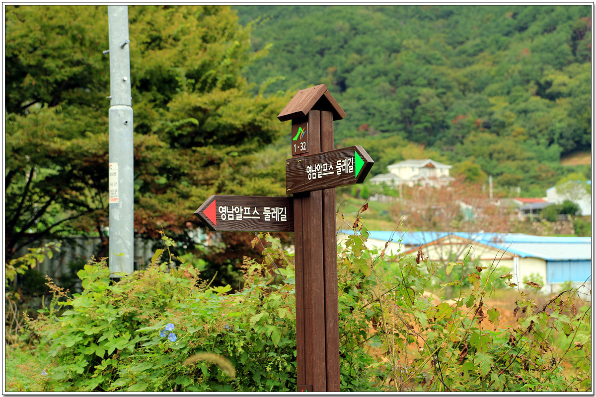 영남알프스 둘레길 이정표 앞에서 왼쪽 둘레길 쪽으로 꺾는다