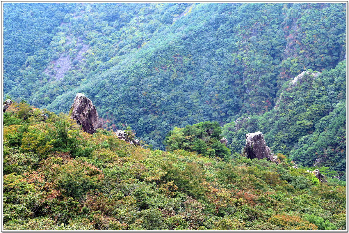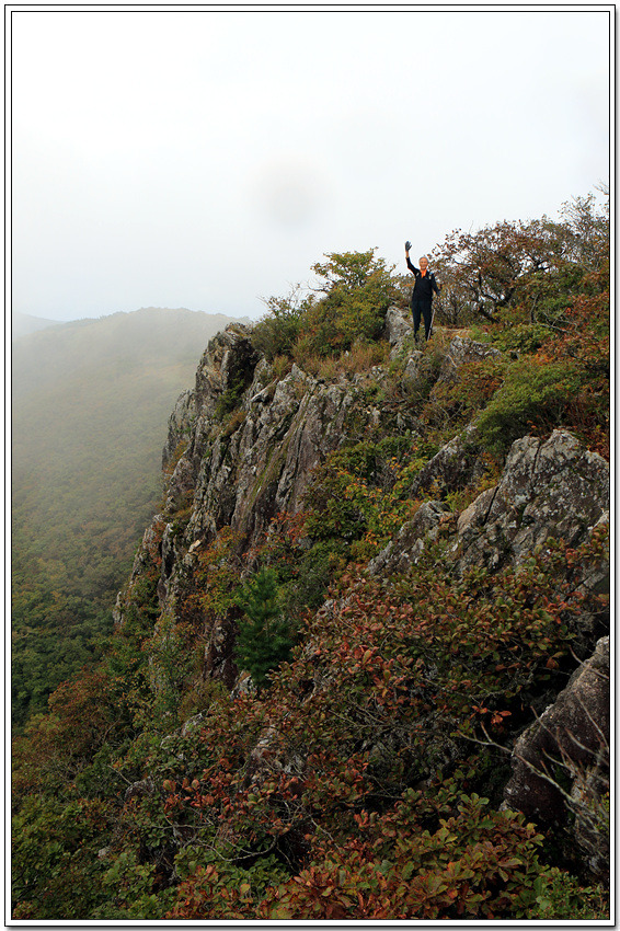 저 아래 아리랑릿지와 쓰리랑릿지 꼭대기 부분 암봉이 모습을 드러내 보인다