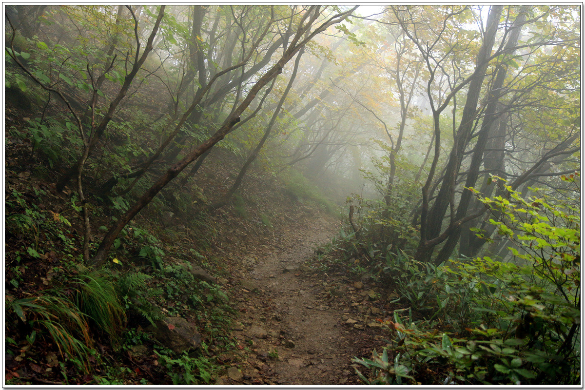조망하나 없는 숲속길에 아침까지 내린 빗물을 머금은 나뭇가지를 헤치고 가자니 그야말로 고역이었다