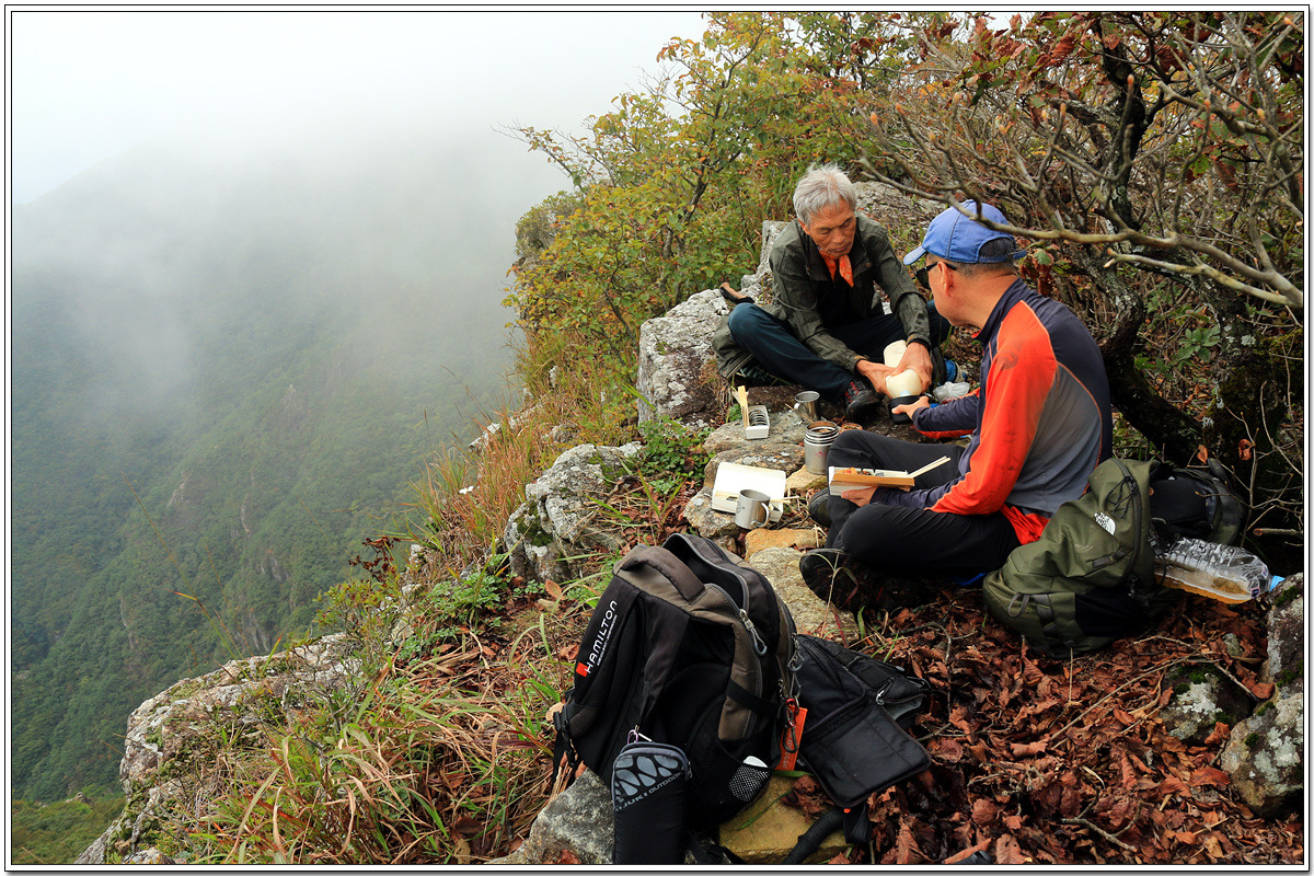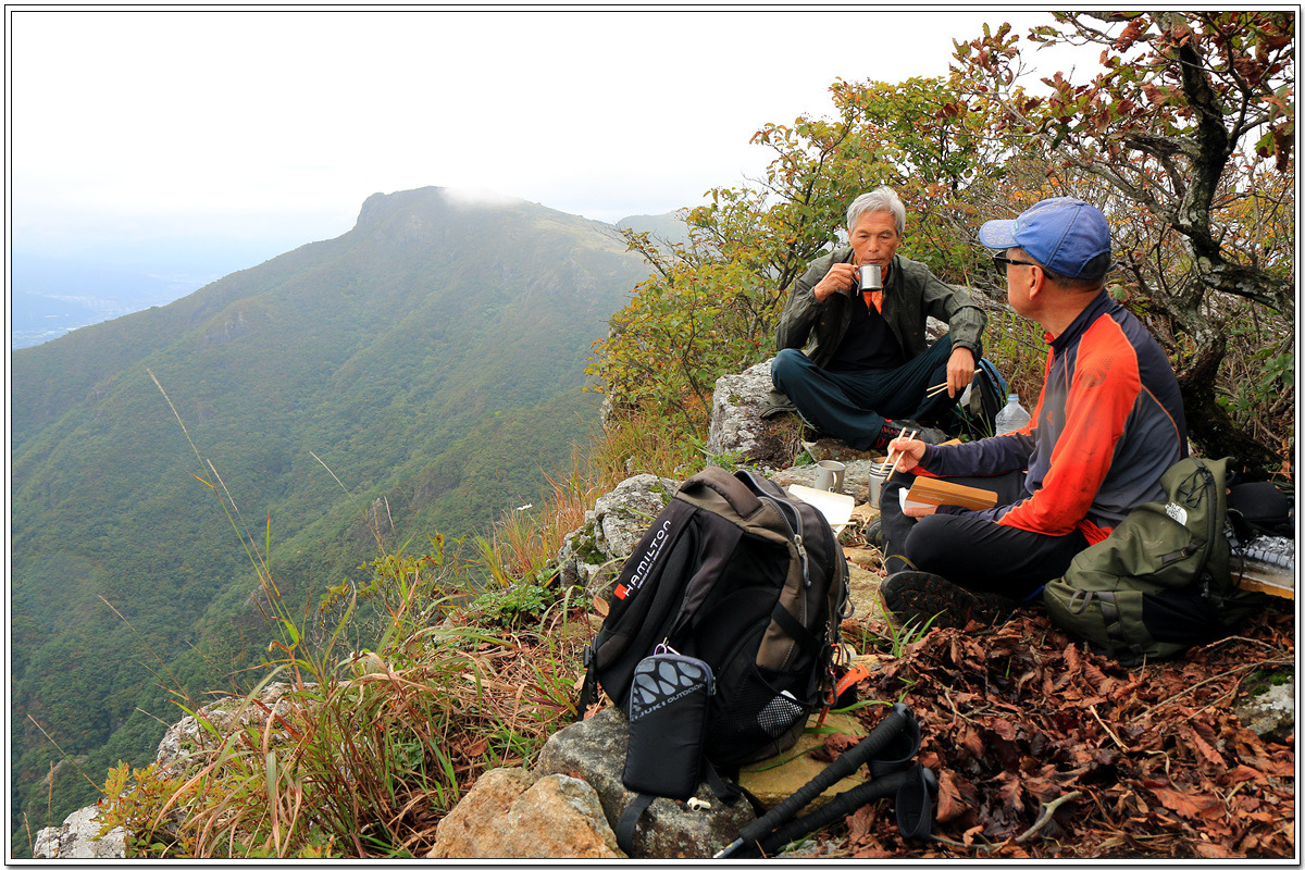 상투바위 전망대 바위벼랑 옆 조망 좋은 곳에 자리를 잡고 점심상을 벌린다