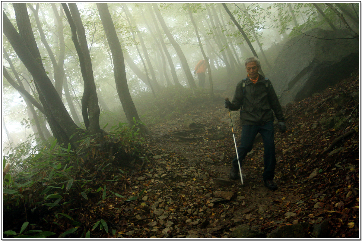 피밭등으로 가기위해 왼쪽으로 내려갔지만 짙은 구름속에서 피밭등과 단조산성터를 찾을 수가 없었고
