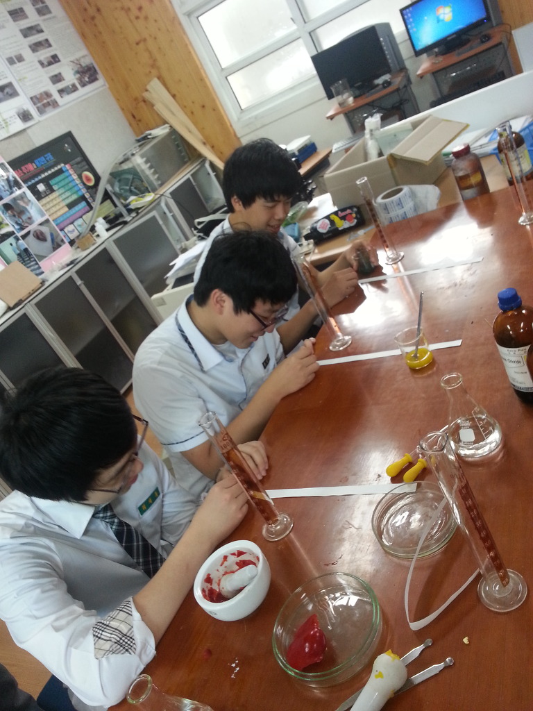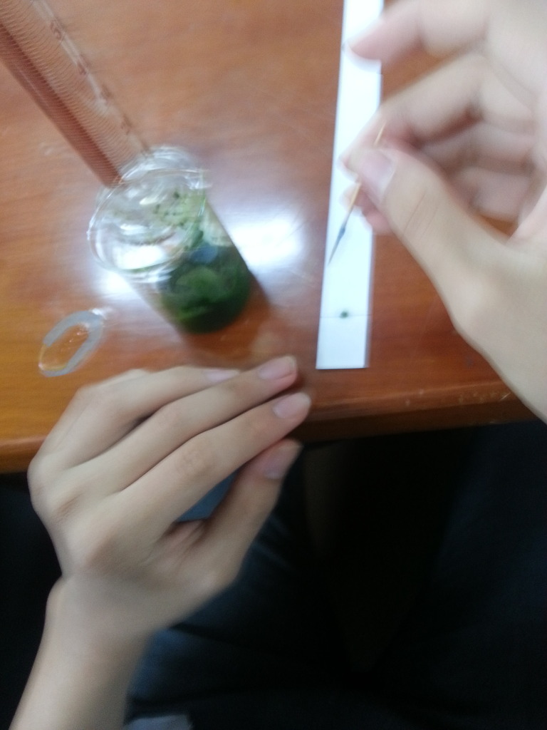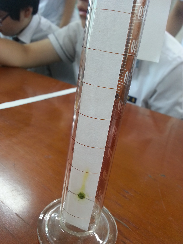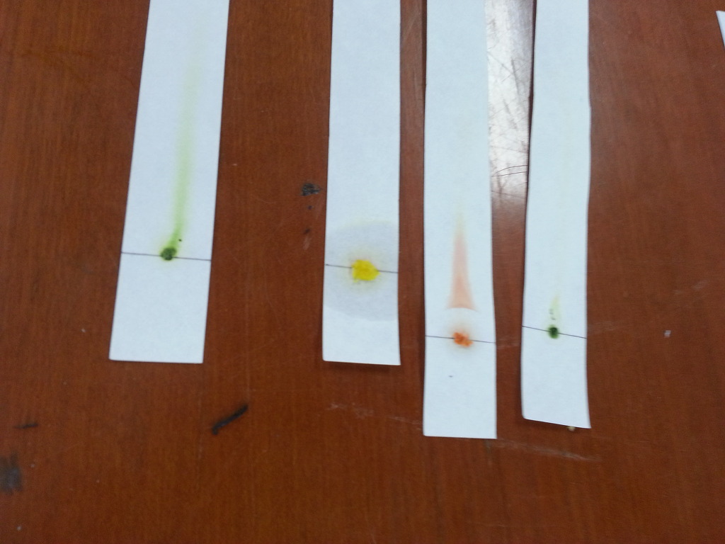 크로마토그래피 용지를 시험관 크기에 맞게 자른 뒤, 아래 끝에서 2cm 위쪽에 출발선을 연필로 긋고, 중앙에 ․표(원점)를 한다. 엽록소 추출액을 이쑤시개로 찍어서 용지의 출발점에 직경 2-3mm정도가 되도록 20여회 반복하여 묻힌다.