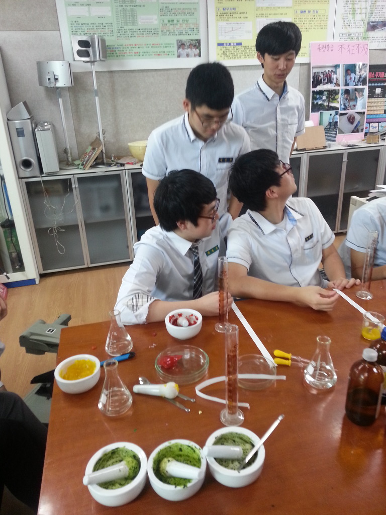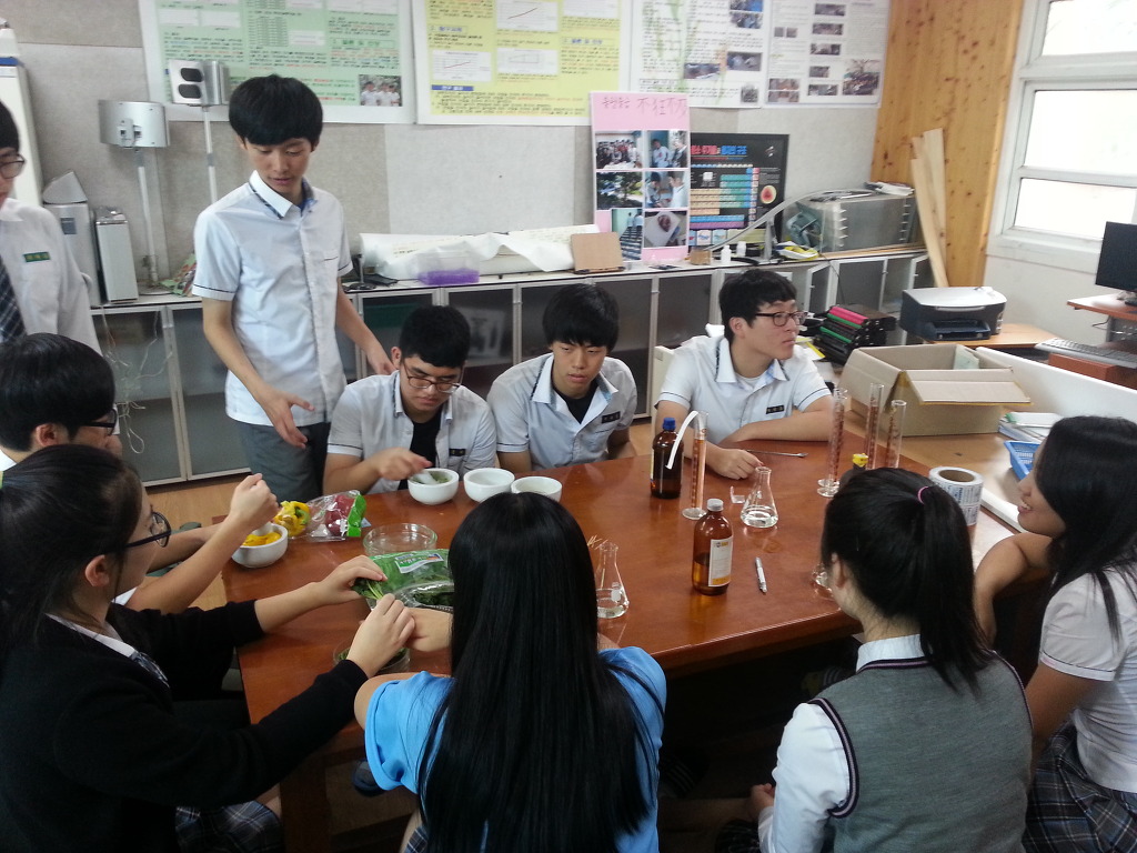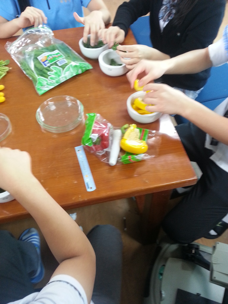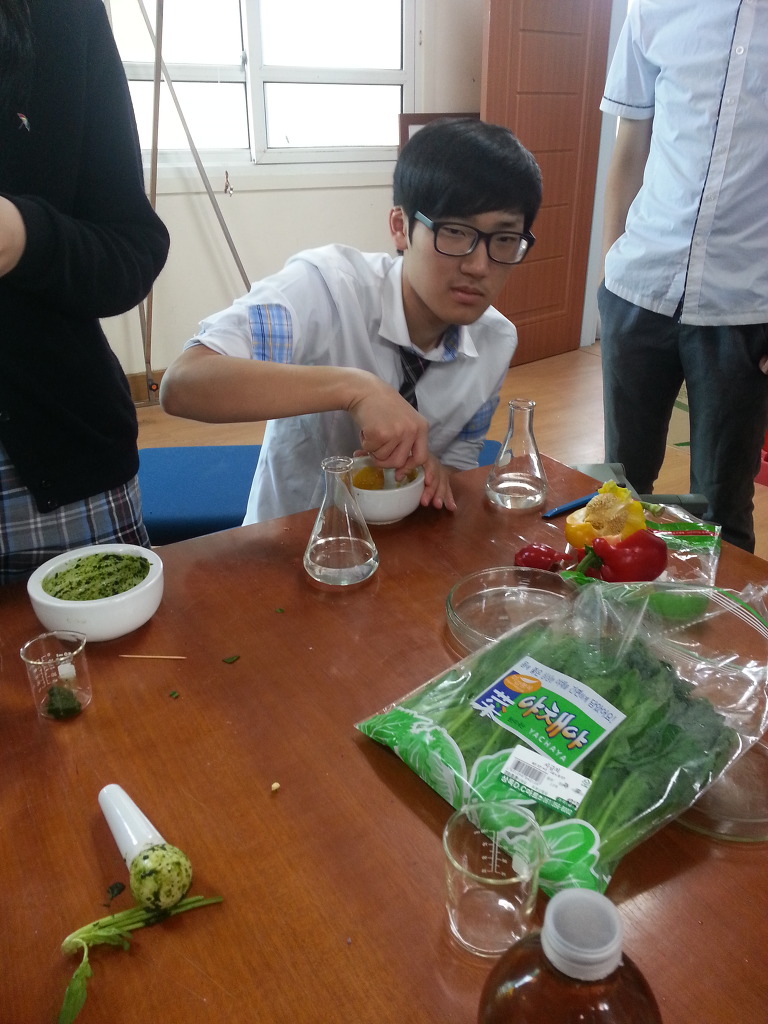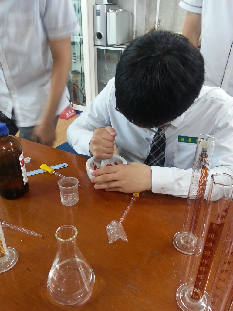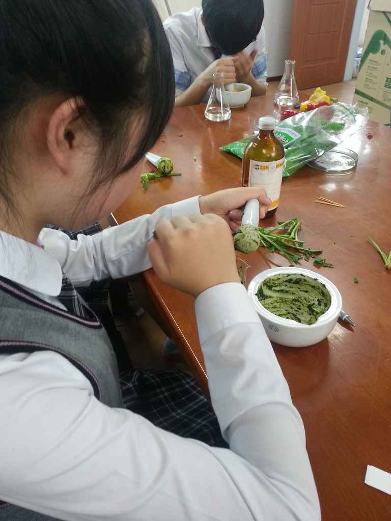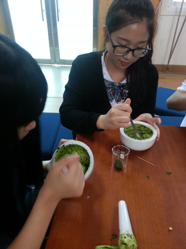 시금치 잎을 가위로 잘게 잘라 막자사발에 넣고, 엽록소 추출액(메탄올:아세톤=3:1)을 넣고 고운 입자가 되게 갈아준다.