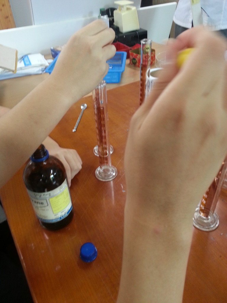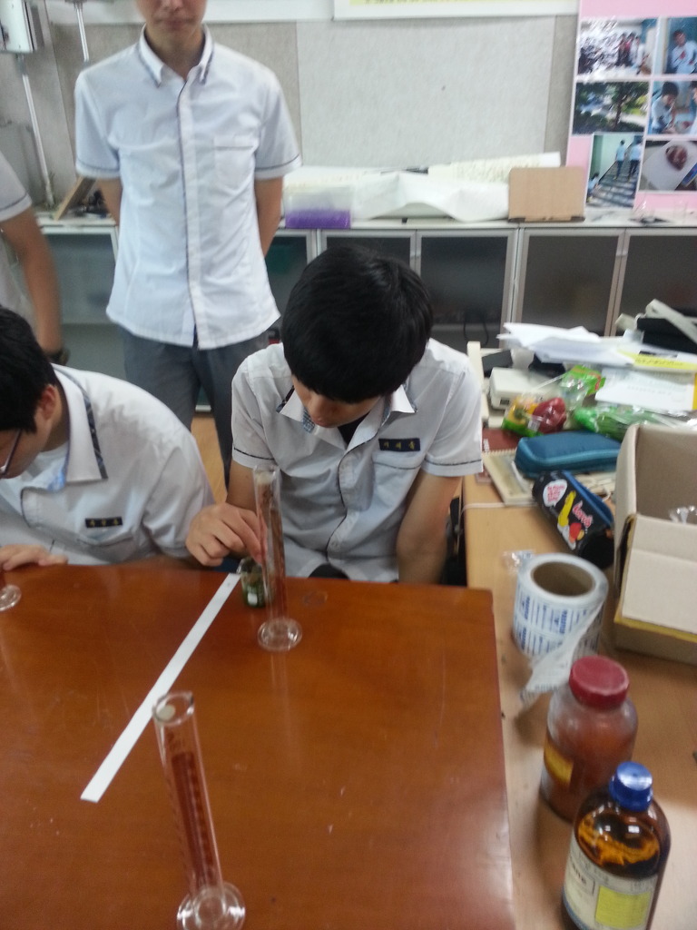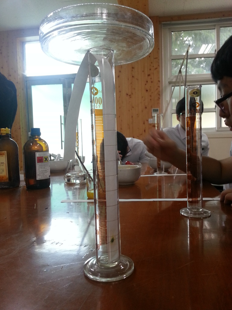 시험관에 바닥으로부터 1cm정도 전개액을 넣어준다. 원점의 잎 추출액이 마르면 용지를 시험관에 넣어주고, 고무마개를 닫은 후 용매가 용지 끝에서 1cm정도 떨어진 부분까지 올라갈 때까지 전개시킨다.