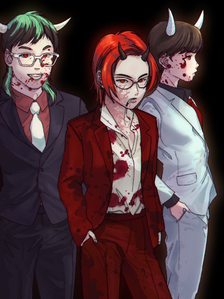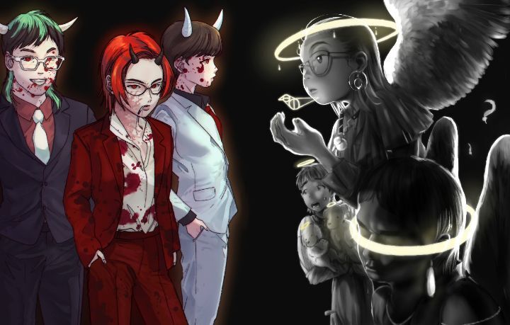첫번째 그림의 악마(자유)×천사(난춘)컨셉으로 왼쪽은 제가, 오른쪽은 다른 코딱지분이 그려주셨어요