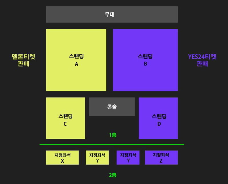 – 스탠딩은 무대 앞 1층 플로어 공간이며 지정 좌석은 2층의 단차가 있는 좌석 공간입니다.