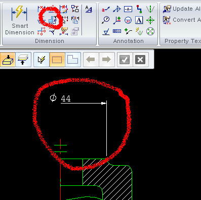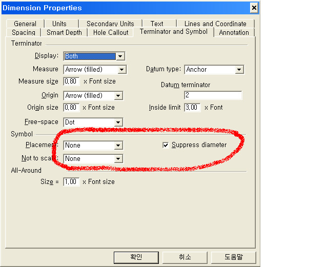 치수기입 후 직경44를 마우스 오른쪽 버튼으로 선택 후 properties -> terminator and symbol 탭을 선택합니다.