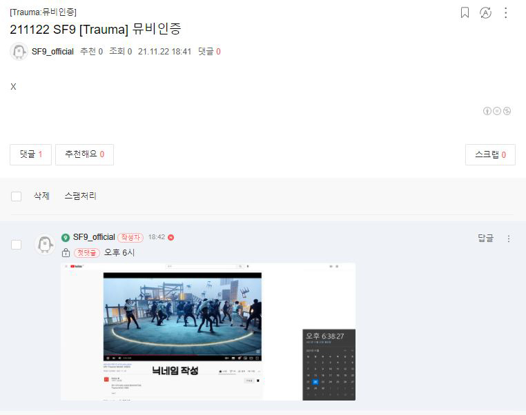 글제목 : 210000 SF9 [Trauma] 뮤비인증