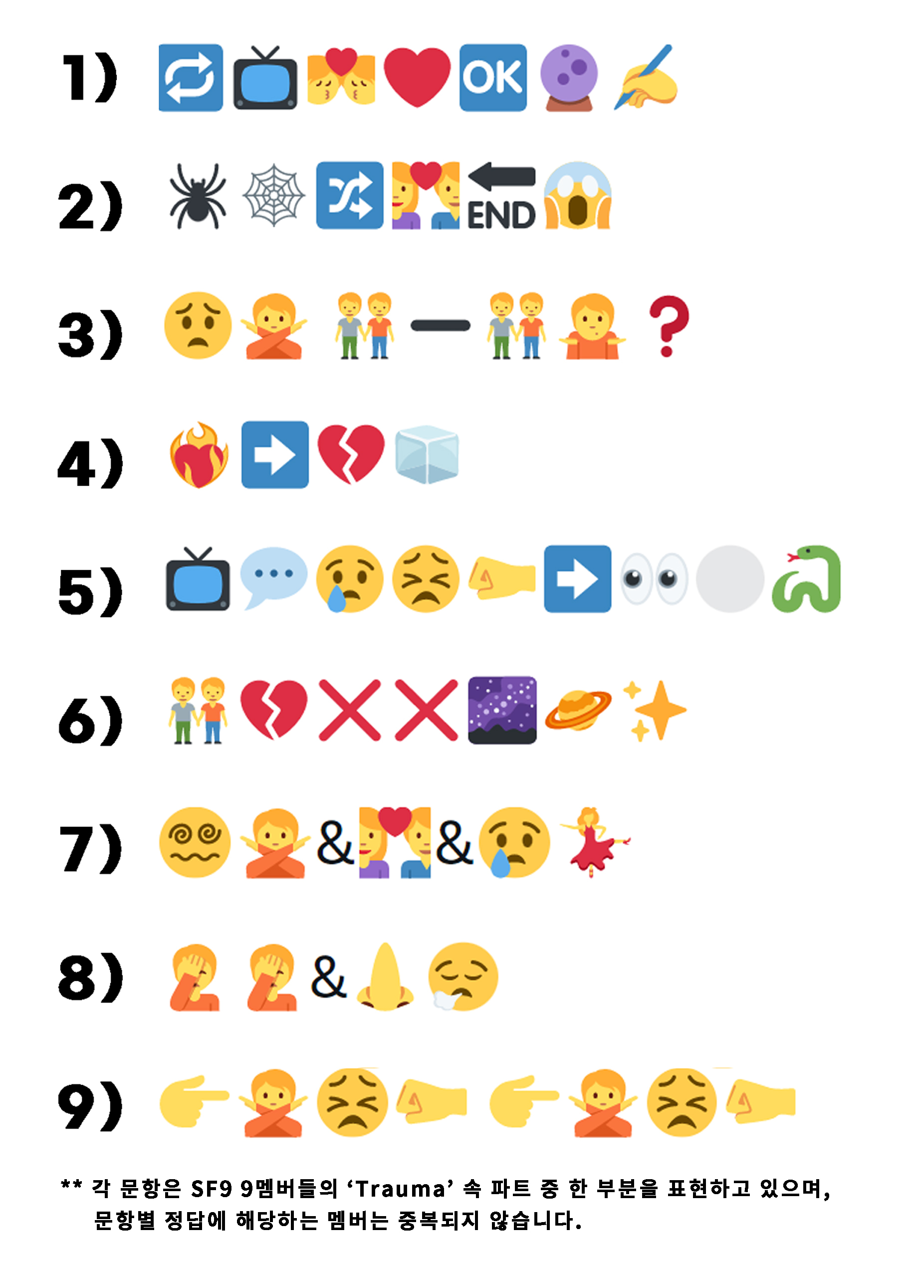 1. [Trauma:이모지 Drama] 게시판에 안내된 이모지로 표현된 SF9 ‘Trauma’ 속 9개의 파트들을 확인한다.