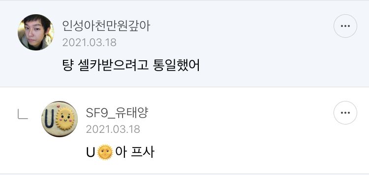 [인성]인성아 태양이가 내 프사 지적했어 한마디해줘 작성자인성아천만원갚아|작성시간21.03.24|조회수1,732 목록 댓글 1 글자크기 작게가 글자크기 크게가 ㅋㅋㅋㅋㅋㅋㅋ내 프사 괜찮지않아?객관적으로 어때? 다음검색 현재 게시글 추가 기능 열기 북마크 공유하기 신고 센터로 신고 댓글 댓글 1 댓글쓰기 답글쓰기 댓글 리스트 작성자SF9_인성 | 작성시간 21.03.24 프사 ...바꿔주세요...(털썩) 댓글 전체보기